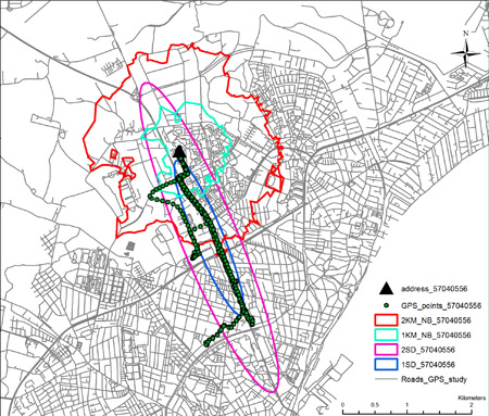 Vi kender således ikke cyklisters aktionsradius i detaljer. Dermed ved vi ikke hvilken størrelse og form, de områder vi skal beregne cykelvenlighed indenfor, skal have. Det problem satte vi os for løse.Vi udstyrede 78 cyklister i Aarhus med en GPS modtager og indsamlede data på alle deres cykelture i 7 dage. Figur 1 nedenfor viser et billede af en cyklists’ ture i Aarhus. Figur angiver det område vedkommende bor indenfor, vedkommendes adresse, to netværksbuffere og de to ellipsebuffere. Som det kan ses ud fra figuren vil forskellige områder ikke ”fange” lige meget cykeladfærd målt som GPS punkter.Meget cykling foregår udenfor området. Derfor vil en beregning af ovennævnte faktorer indenfor det turkise område sandsynligvis ikke give mening, da enhver sammenhæng eller ikke-sammenhæng, ville medføre forkerte antagelser om faktorernes betydning.