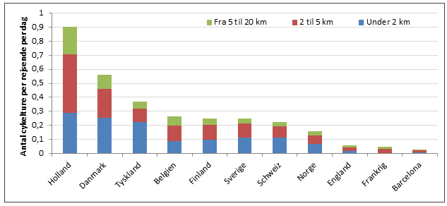 Figur 2: Antallet af cykelture pr. person pr. dag inddelt i 3 turlængder: Cykelture under 2 km, 2-5 km, samt cykelture på mellem 5 og 20 km. Opgørelsen er et delresultat af COST projektet SHANTI og baserer sig på diverse europæiske transportvaneundersøgelser udført mellem 2006 og 2010.