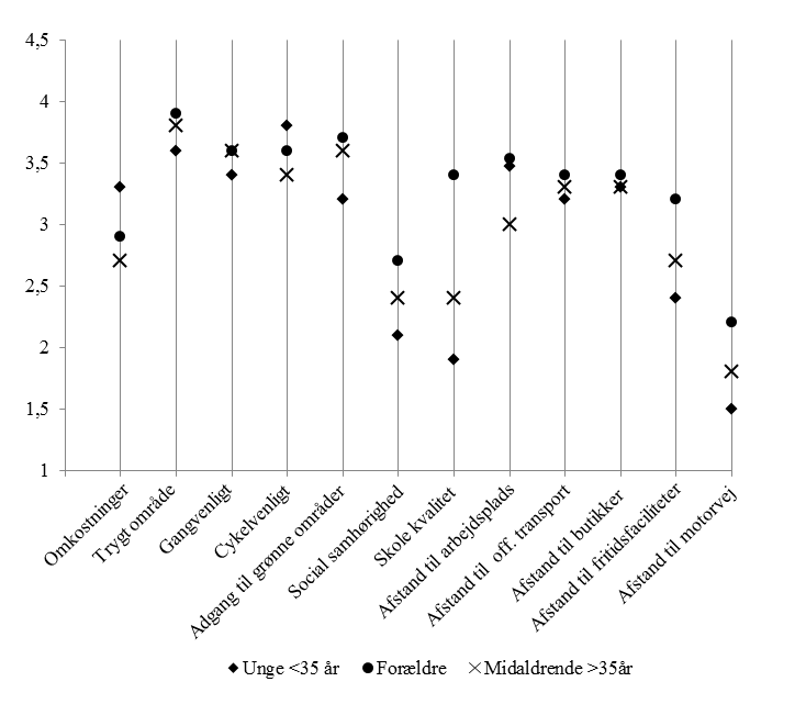 En af hypoteserne i undersøgelsen var, at bopæls-præferencerne er forskellige for deltagerne i forskellige livsfaser. Deltagerne blev derfor inddelt i tre grupper: Unge under 35 år uden børn, forældre til børn under 18 år uanset alder, og endelig personer over 35 år uden børn. Det viste sig overordnet, at muligheder for cykling og gang havde næsthøjest præference, kun overgået af følelsen af tryghed i området. Der var dog også forskelle mellem deltagerne fra de tre livsfaser. De unge lagde mest vægt på lave omkostninger og gode muligheder for cykling, mens forældrene i højere grad havde præferencer for kvaliteten af skoler, fritidsmuligheder og social samhørighed (se figur 2).