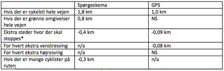 Tabel 1: Hvor langt er danskerne villige til at cykle yderligere i forhold til en tur på fem kilometer – belyst både ud fra en spørgeskemaundersøgelse og ved at analysere cyklisternes faktiske adfærd ved hjælp af GPS. ’NS’ betyder at der ikke kunne findes en statistisk sikker sammenhæng, ’n/a’ at forholdet ikke blev undersøgt i den givne del af analysen.