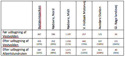 Tabel 2: Det gennemsnitlige antal daglige cyklister før og efter forbedringerne af ruten langs Vestvolden og Albertslundruten. I parentes er angivet stigningen i procent. Opgørelsen er baseret på tællestationerne i perioden 2010-2013 og er korrigeret for sæson og vejr.