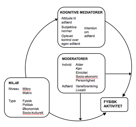 Figuren viser således sammenhængen mellem omgivelsernes indvirkning på adfærden (fysisk aktivitet) som påvirkes direkte af vores baggrund (moderatorer) og mere indirekte af såkaldte kognitive mediatorer.