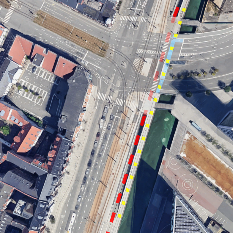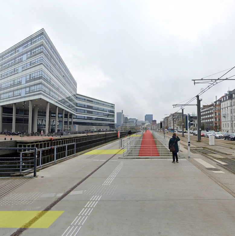 Området ved Navitas er det centrale adgangspunkt for Aarhus Ø1 og Ø2. Her deles cyklister, der skal dreje til højre og venstre (gul markering, mod Aarhus Ø), med fodgængere på belægning uden markeringer. Cyklister, der skal ligeud, kører ned i en tunnel (rød markering). Billede: Google Maps med Cyklistforbundets rutemarkeringer