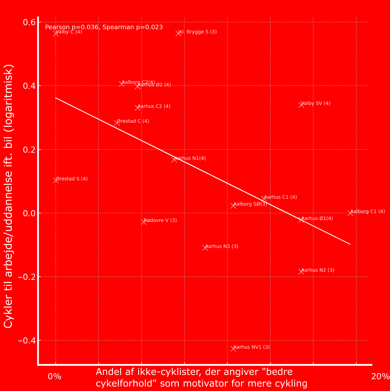 Der er en stærk bivariat negativ sammenhæng mellem hvor mange, der cykler til arbejde sammenlignet med bil, og hvor stor en andel af ikke-cyklisterne i området, der angiver bedre cykelforhold og/eller mindre utryghed ift. flerpartsuheld som motivator for mere cykling. Sammenhængen (p<0,1) ses desuden for flere andre cykelkategorier, fx cykling som formål i sig selv og kombinationsrejsecykling.