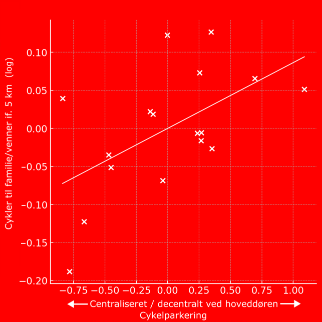 I caseområder som Aarhus Ø2, hvor der er mange indgange med cykelparkering ved hoveddøren, ses også høj cykelaktivitet for ture til familie og venner inden for 5 km. I kontrast ligger Aarhus N3 med lange facader uden nær adgang til cykelparkering og i stedet bilparkering foran dørene – hvilket for mange gør bilen mere attraktiv end cyklen. Alt i alt peger data og brugeroplevelser på, at cykelparkering, når den placeres praktisk og synligt, kan gøre en markant forskel for, om cyklen prioriteres i daglig transport.
