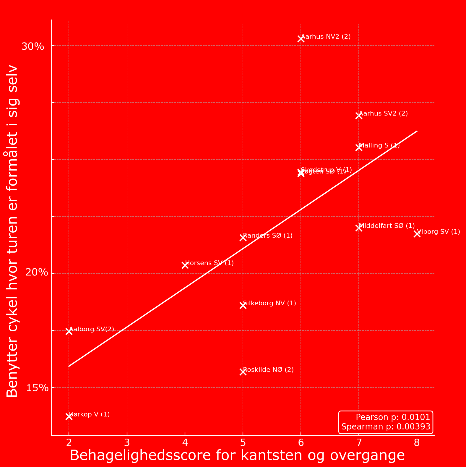Sammenhængen mellem behagelige overgange i området og cykling som formål i sig selv er stærk, også selvom man tager højde for socioøkonomi og byplanrelaterede variable (p<0,08).