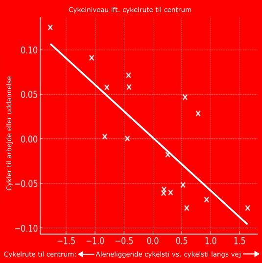 Vores undersøgelser viser, at fritliggende og gnidningsfri cykelstier til centrum har en stærk positiv effekt på cykelniveauet til arbejde og uddannelse – både i bivariate analyser og i multiple statistiske modeller. Med fritliggende stier menes stier, der ikke ligger langs bilveje, og som derfor har færre stop, færre konflikter og en mere flydende rejseoplevelse. Disse forhold betyder, at cyklister kan komme hurtigere frem og samtidig opleve turen som mere sikker og behagelig.
