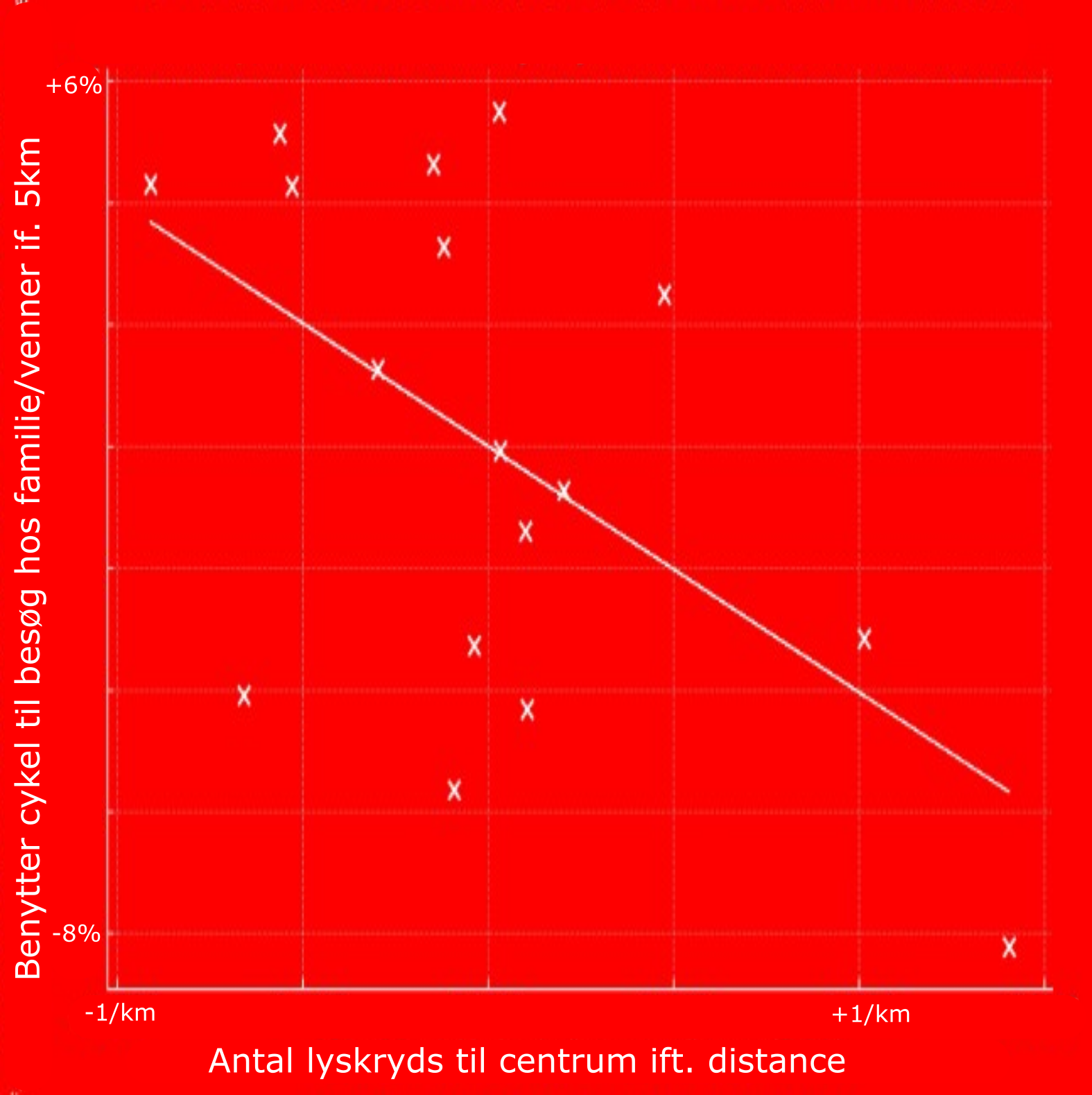 Sammenhængen mellem, hvor mange lyskryds man møder på vejen til byen, er stærk, også når man tager højde for socioøkonomi, topografi og byplanrelaterede faktorer (p<0,03). Sammenhængen ses også bivariat for det generelle cykelniveau (p<0,03) og cykling til arbejde/uddannelse (p<0,06).
