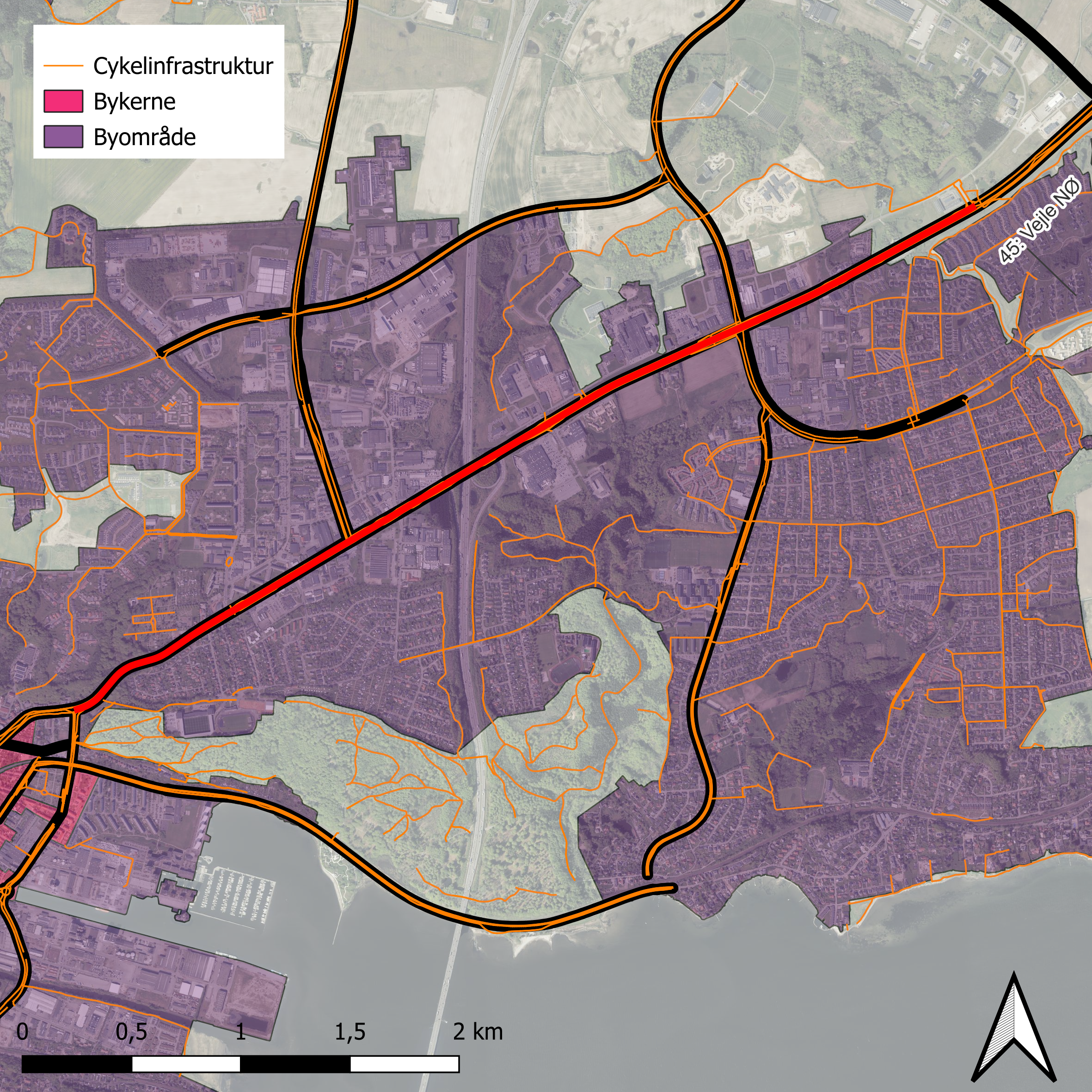 Der er cykelstier fra Vejle NØ til centrum, men det er langs en trafikeret indfaldsvej med adskillige store lyskryds, der afbryder flowet for cyklisten.