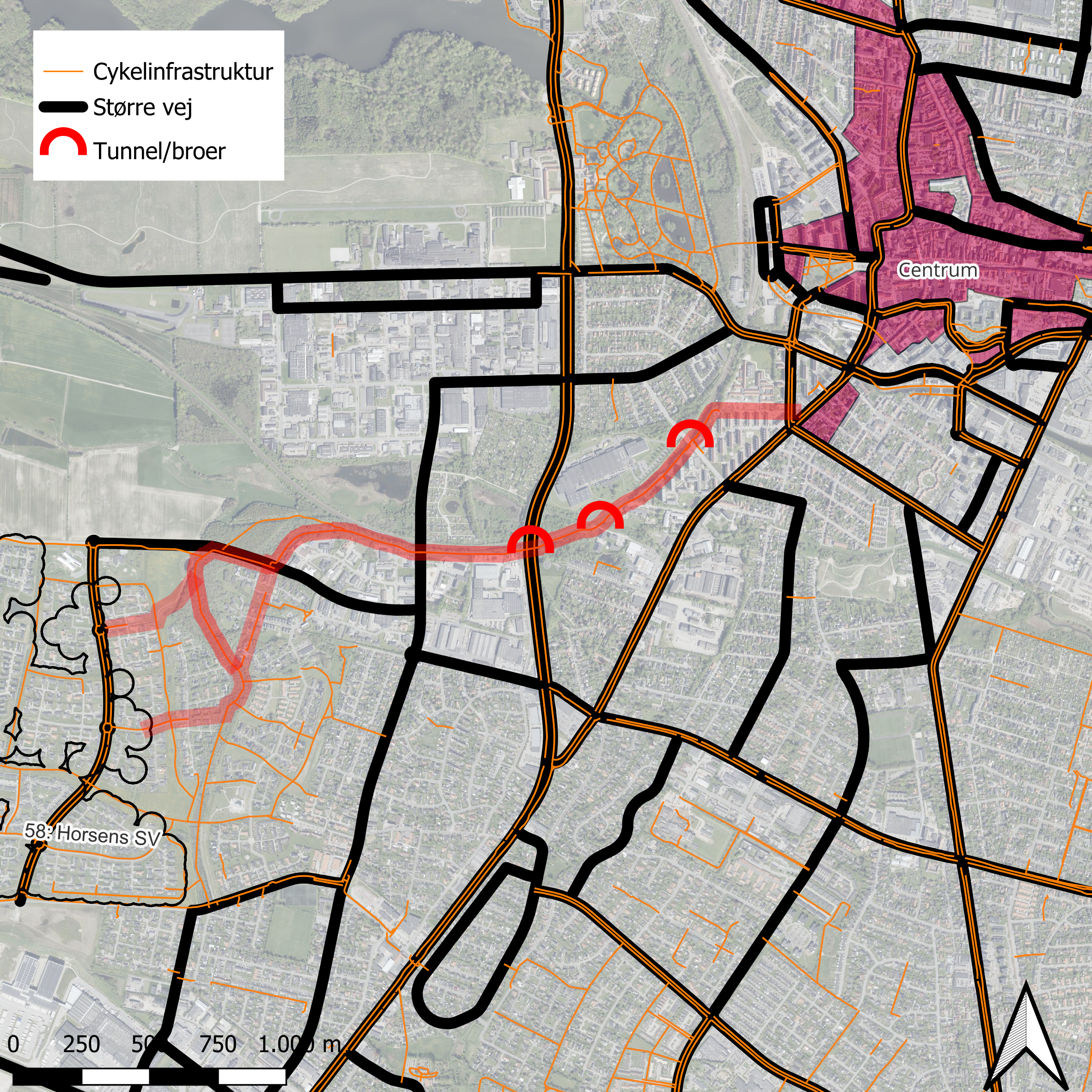 Fra Horsens SV er der en god forbindelse ind mod byen langs jernbanen med krydsning af flere store veje i tunnel.