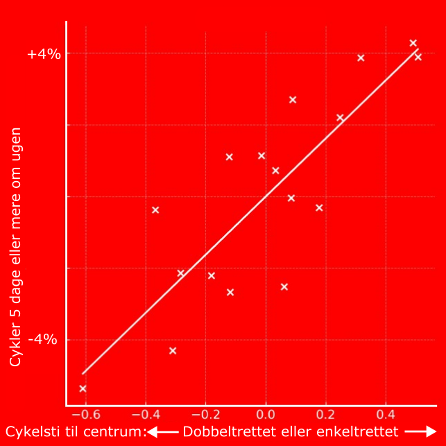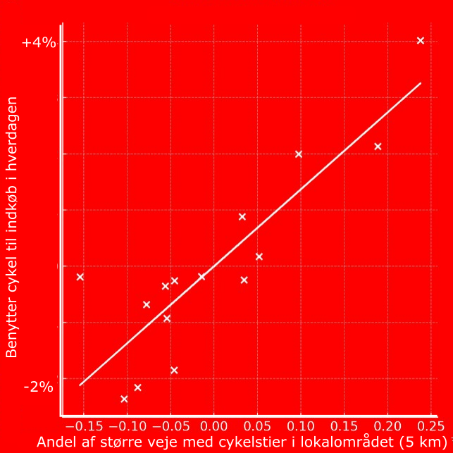 Cykelstier langs større veje spiller en afgørende rolle i vores undersøgelser for cyklens attraktivitet i lavtætte byområder, hvor alternativer til hovedfærdselsårer ofte er få. Større veje uden cykelsti nævnes af mange beboere som en direkte barriere for cykling og en kilde til utryghed i trafikken. Denne oplevelse understøttes af vores analyser: Der er en klar statistisk sammenhæng mellem andelen af større veje med cykelsti i et lokalområde og niveauet af cykling – både generelt og fx til indkøb. Jo større andel af de trafiktunge veje, der er forsynet med cykelstier, desto højere er sandsynligheden for, at beboere vælger cyklen.