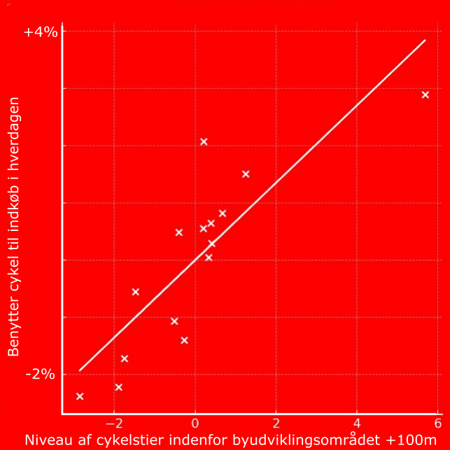 Rigtig mange beboere angiver at cykelstier er vigtige - og i vores undersøgelser kan det statistisk også påvises, at deres tilstedeværelse i selve byudviklingsområdet hænger sammen med mere cykling. Statistisk kan det påvises, at cykelinfrastruktur indenfor byudviklingsområderne hænger sammen med et højere cykelniveau på tværs af flere cykelformål. Der ses klare bivariate sammenhænge mellem tilstedeværelsen af cykelstier, og hvor ofte cyklen vælges både generelt og til fx pendling og indkøb. Endnu vigtigere er, at sammenhængene også kan spores i regressioner, hvor der tages højde for faktorer som befolkningstæthed, afstand til centrum og andre centralitetsvariable. Det betyder, at effekten af cykelinfrastruktur ikke blot er en afledt konsekvens af byens tæthed, men i sig selv spiller en selvstændig rolle i at fremme cykling.