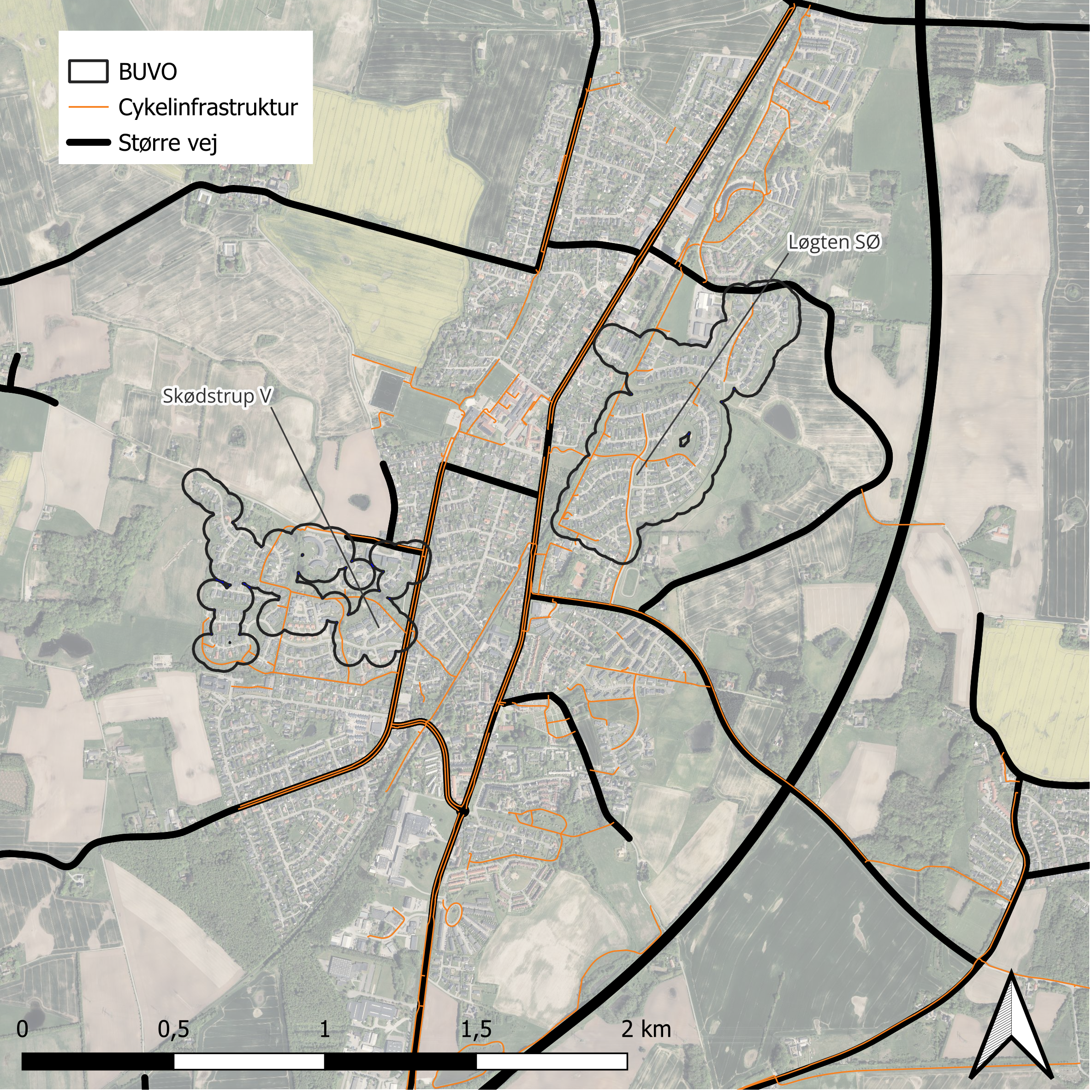 Løgten SØ og Skødstrup V ligger tæt på hinanden og er omgivet af landområder med landeveje uden cykelstier. Begge områder scorer ligeledes lavt på cykling på tværs af flere kategorier og bakkes op af beboerudsagn om, at manglende cykelstier er en medvirkende årsag.