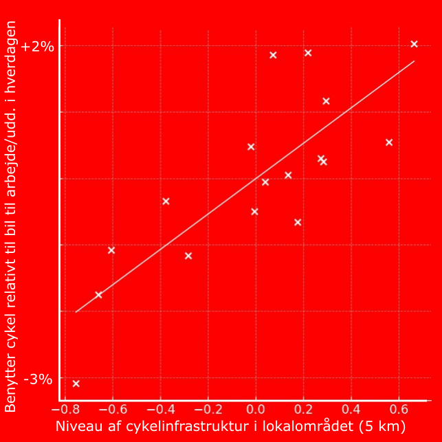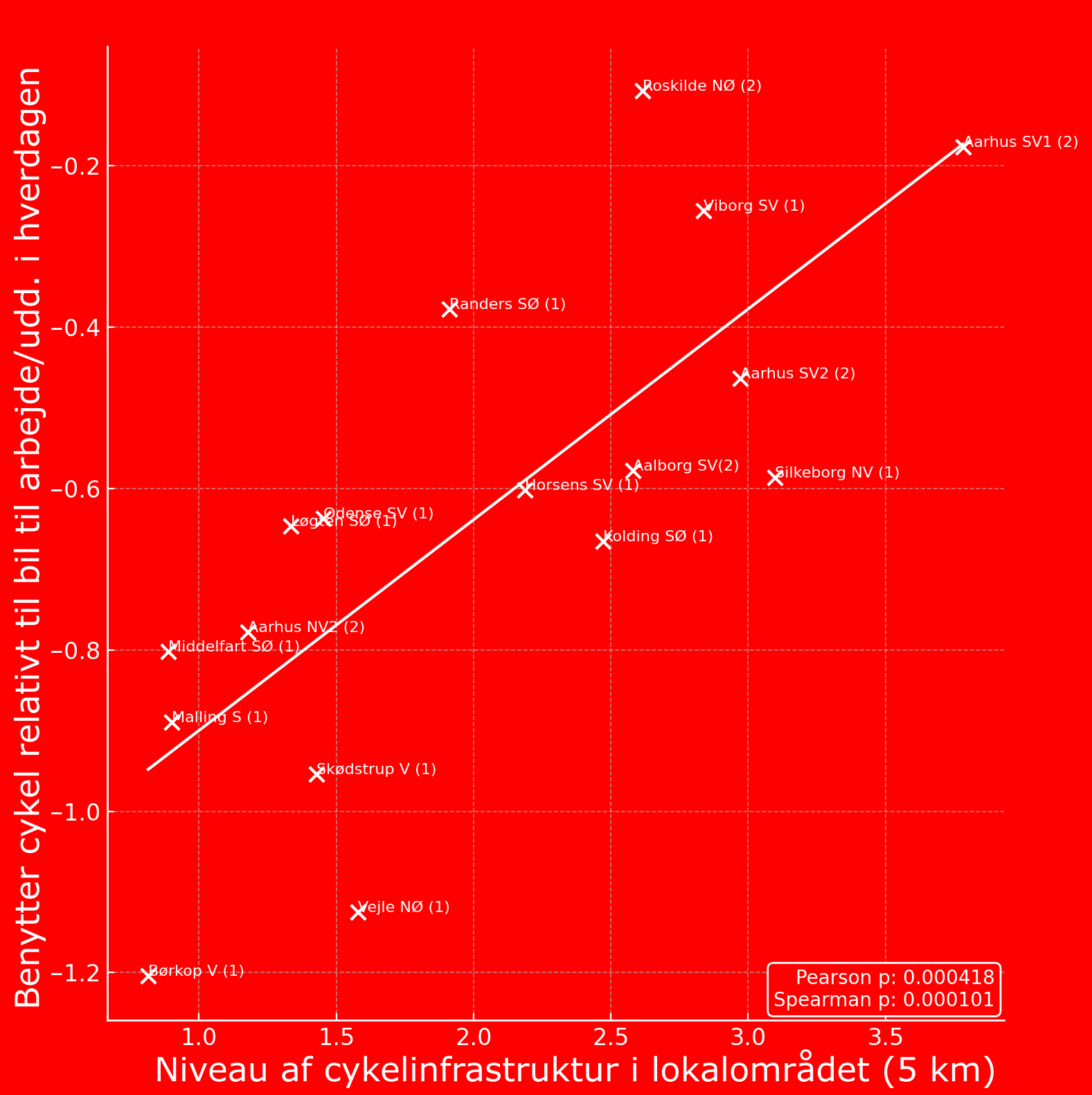 Der er en stærkt signifikant simpel sammenhæng mellem cykling til arbejde/uddannelse og niveauet af cykelinfrastruktur i lokalområdet. Som det ses, er det dog også primært i byudviklingsområder i tættere befolkede områder, der cykles mest.