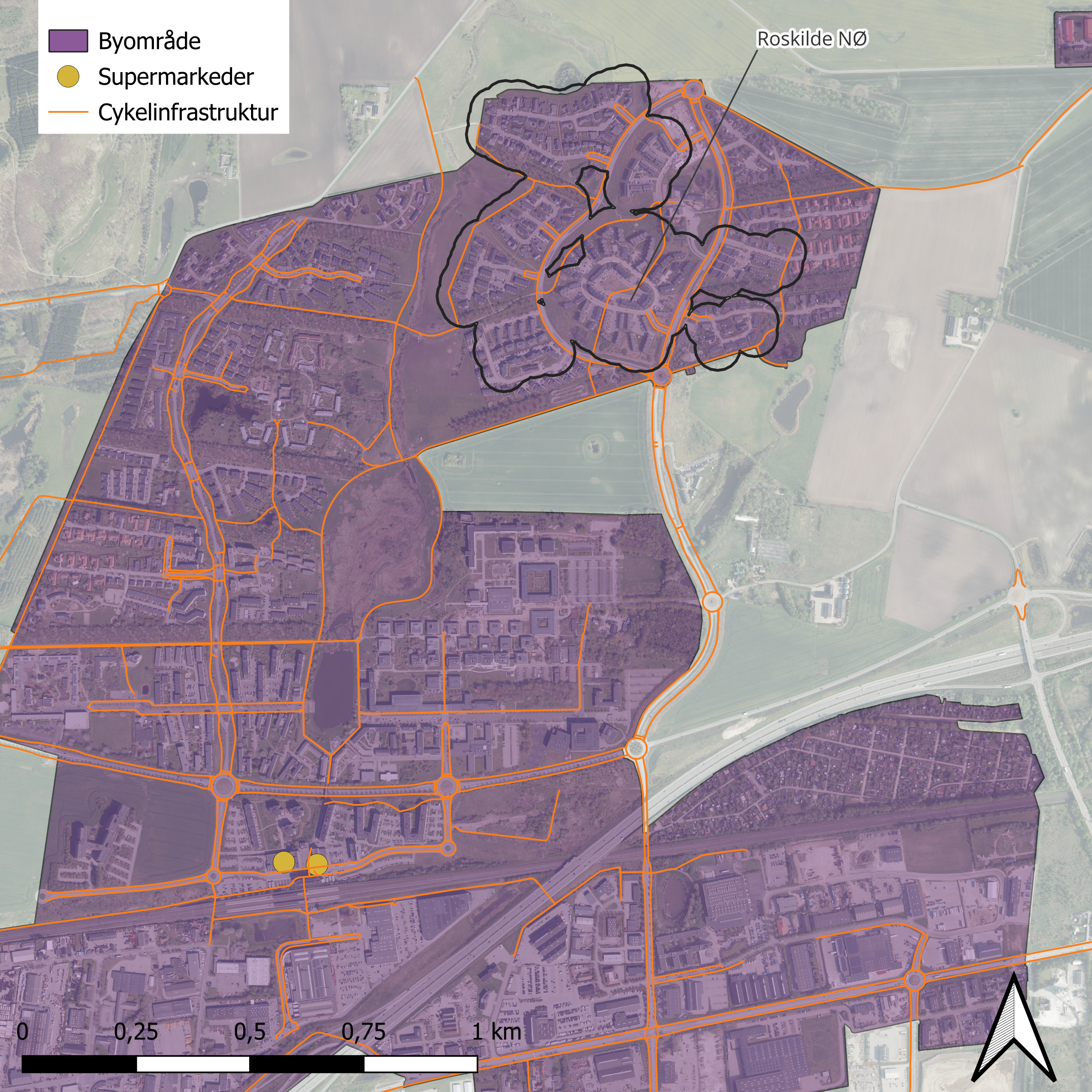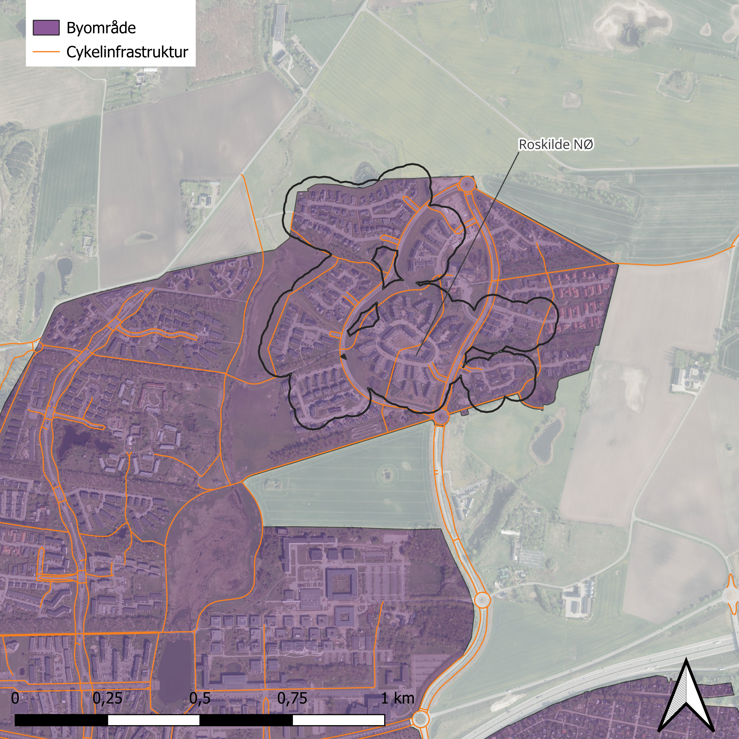 Roskilde NØ har ligeledes en høj andel af intern cykelinfrastruktur og beboere, der cykler til indkøb (31%).