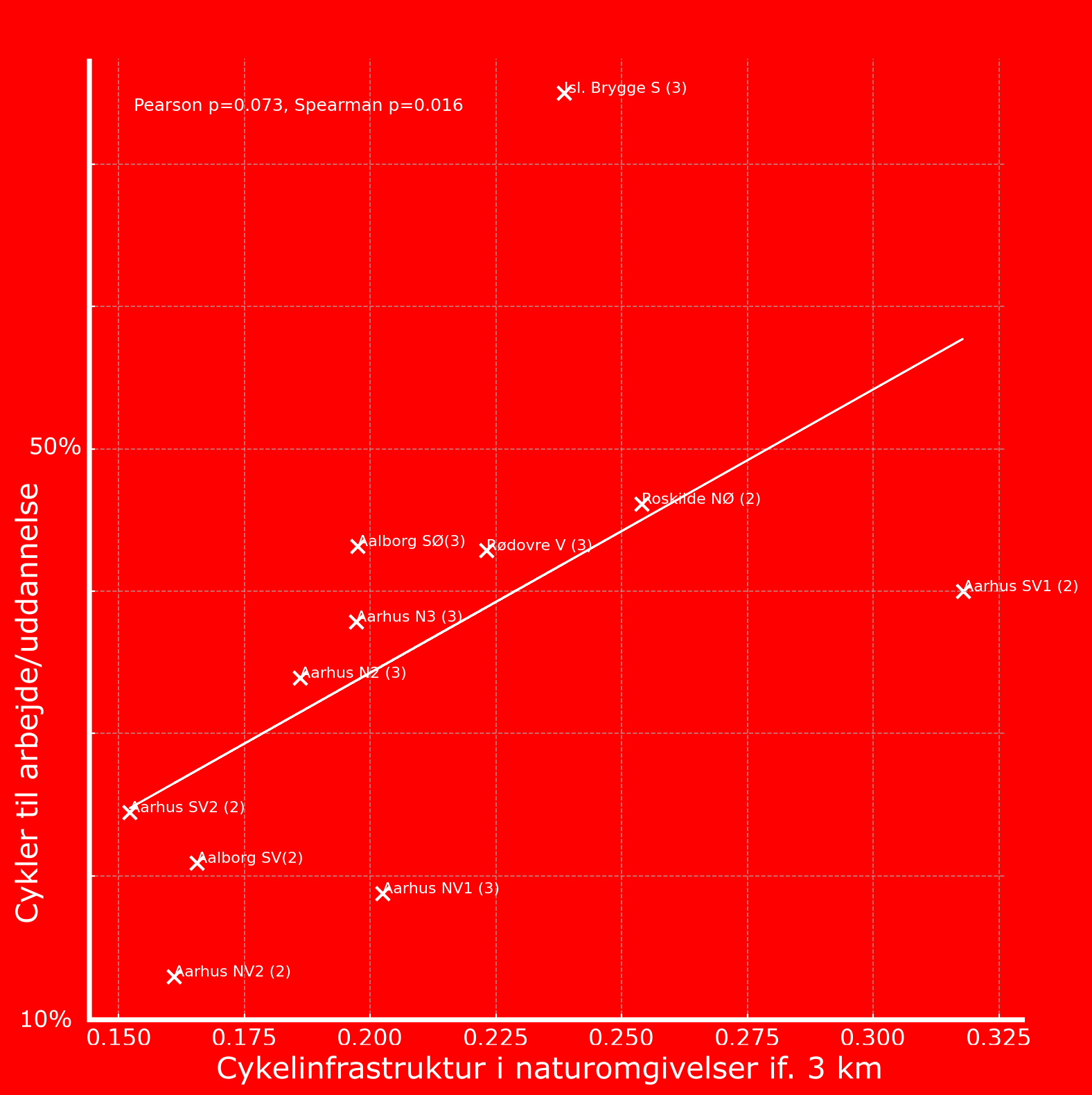 Cykelstiforbindelser i naturomgivelser i nærområdet op til 3 km er en vigtig drivkraft for, at flere vælger cyklen i hverdagen, ifølge vores undersøgelser. Når cykelstier går gennem grønne områder, skove eller langs vandløb, ses der et højere niveau af cykling, især når det gælder hverdagsture til arbejde og uddannelse. De statistiske analyser viser en klar sammenhæng, både i simple bivariate modeller og når der tages højde for socioøkonomi og andre byplanrelaterede faktorer.