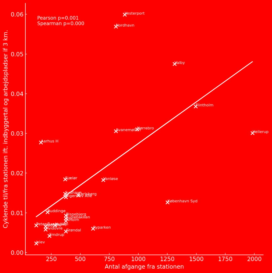 På stationer i de allerhøjest bebyggede områder spiller afgangsfrekvensen en endnu mere afgørende rolle. Her er konkurrencen fra andre transportmidler intens, og passagererne stiller høje krav til både fleksibilitet og tilgængelighed. Jo hyppigere togene kører, desto lettere bliver det at indpasse kombinationen af cykel og tog i hverdagen, fordi rejsetiden opleves som glidende og uden lange ophold. Det kan i vores undersøgelser ses i den simple bivariate sammenhæng mellem andelen af cyklende til stationerne og antallet af arbejdspladser og indbyggere i nærområdet. Tendensen består også, når der tages højde for en bred vifte af byplanrelaterede variable som befolknings- og arbejdspladstæthed.
