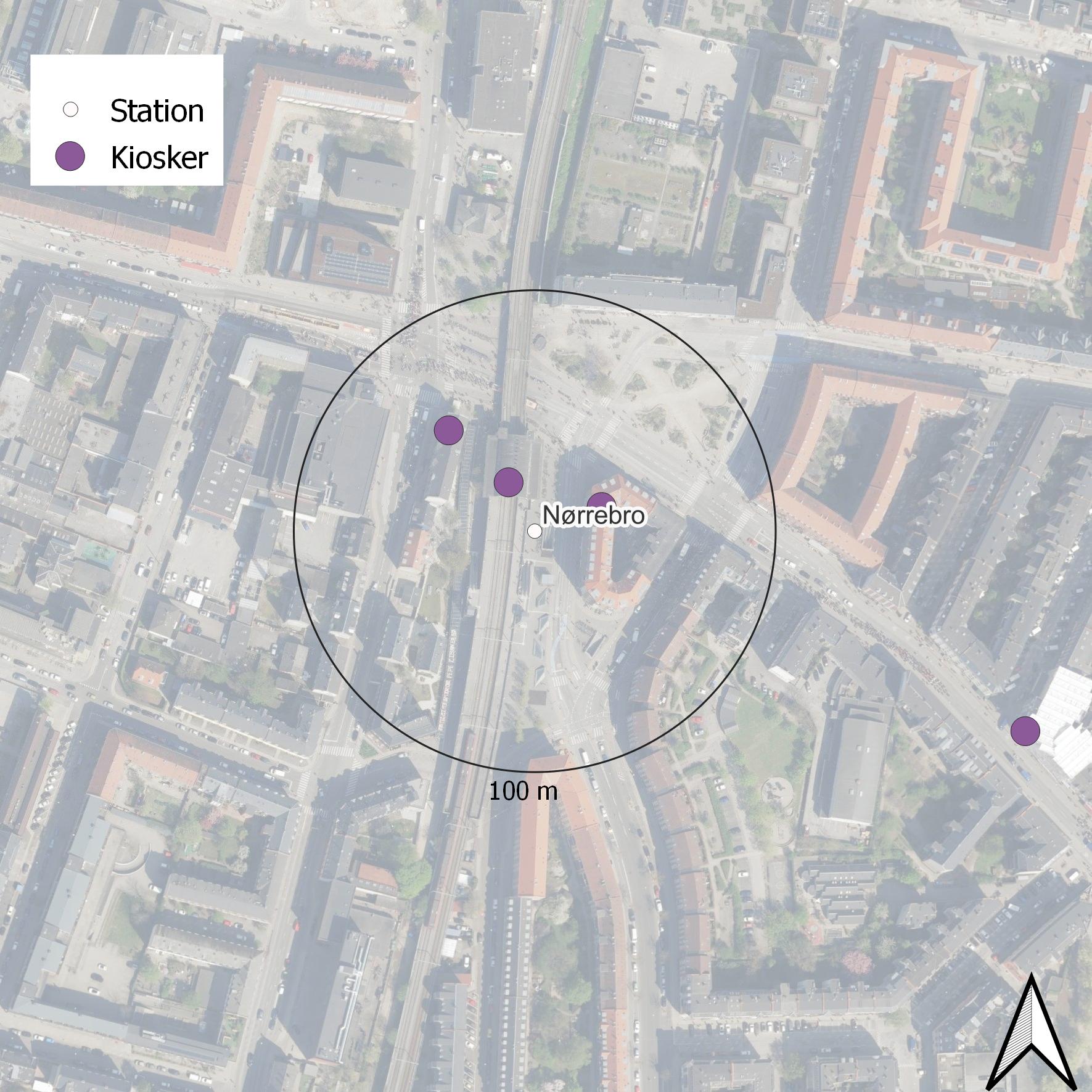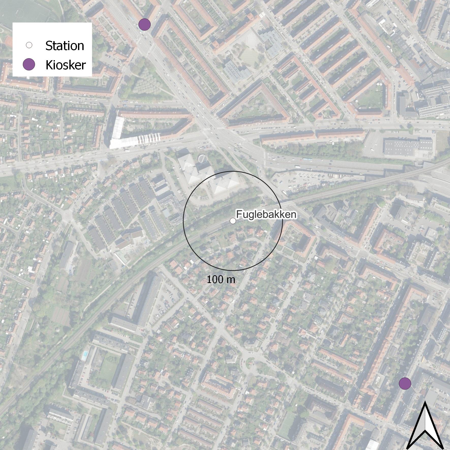 I den kvalitative survey nævnes kiosker ikke specifikt, men supermarkeder og andre dagligdags ærinder omtales som en del af forklaringen på, hvorfor cykel+tog opleves som en praktisk og fleksibel løsning. Det giver grundlag for at konkludere, at både kiosker og supermarkeder bidrager til at styrke cyklens rolle som tilbringer til toget, fordi de integrerer transporten med hverdagsgøremål. Nørrebro Station er et godt eksempel, hvor der er mange cykel+tog-rejsende, og hvor både kiosker/nærkøb og supermarkeder findes i umiddelbar nærhed. Omvendt ses Fuglebakken som et modsatrettet eksempel, hvor indkøbsmulighederne er færre og cykelandelen til stationen også er lavere. Samlet peger både statistiske mønstre og kvalitative indsigter på, at dagligvaretilgængelighed omkring stationerne er en vigtig faktor for at fremme cykel+tog-rejser.