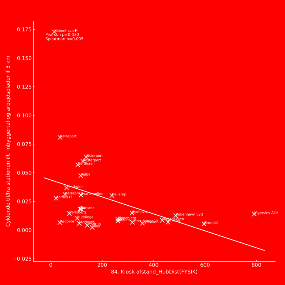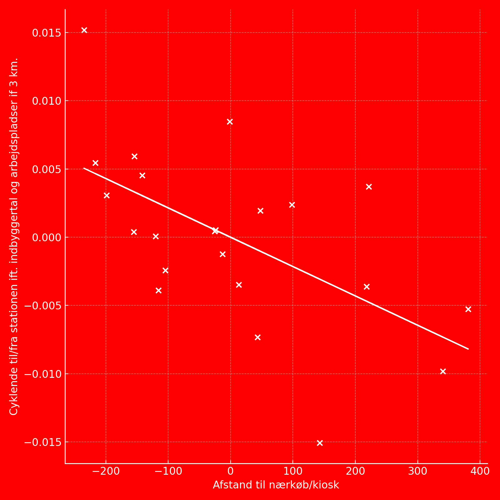 Kiosker og indkøbsmuligheder tæt på stationerne ser ud til at spille en væsentlig rolle for, hvor mange der vælger cykel+tog-kombinationen. De statistiske analyser i vores undersøgelser viser for S-togsstationer en bivariant sammenhæng mellem både kiosker og supermarkeder og andelen af cyklister til stationerne. Når der kontrolleres for faktorer som afgangsfrekvens, befolkningstæthed og opland, er det dog kun kiosker, der bevarer en selvstændig forklaringskraft. Dette tyder på, at særligt de hurtige og let tilgængelige funktioner tæt på stationen kan være en vigtig del af rejsens praktiske logik.