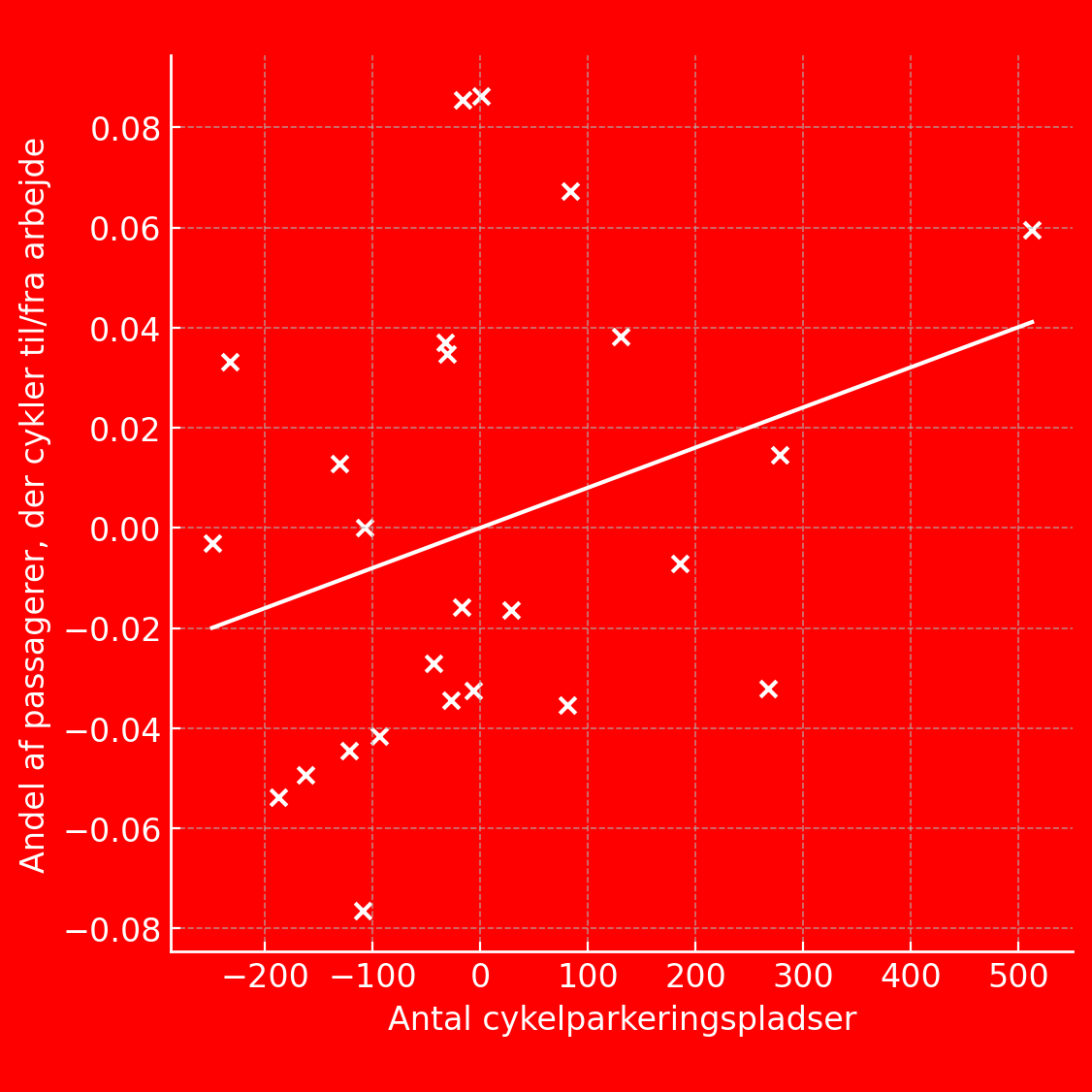 Mange cykelparkeringspladser hænger tydeligt sammen med, at flere passagerer vælger cyklen som tilbringer til toget, viser vores undersøgelser. Den statistiske analyse viser, at antallet af pladser i sig selv er en stærk faktor – også når der justeres for befolkningstæthed, antal afgange fra stationen og andre byplanmæssige forhold.