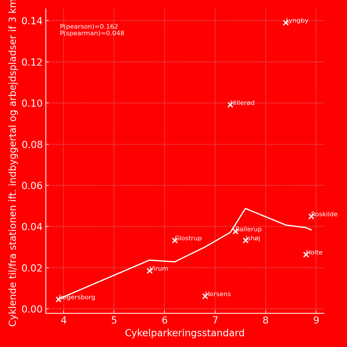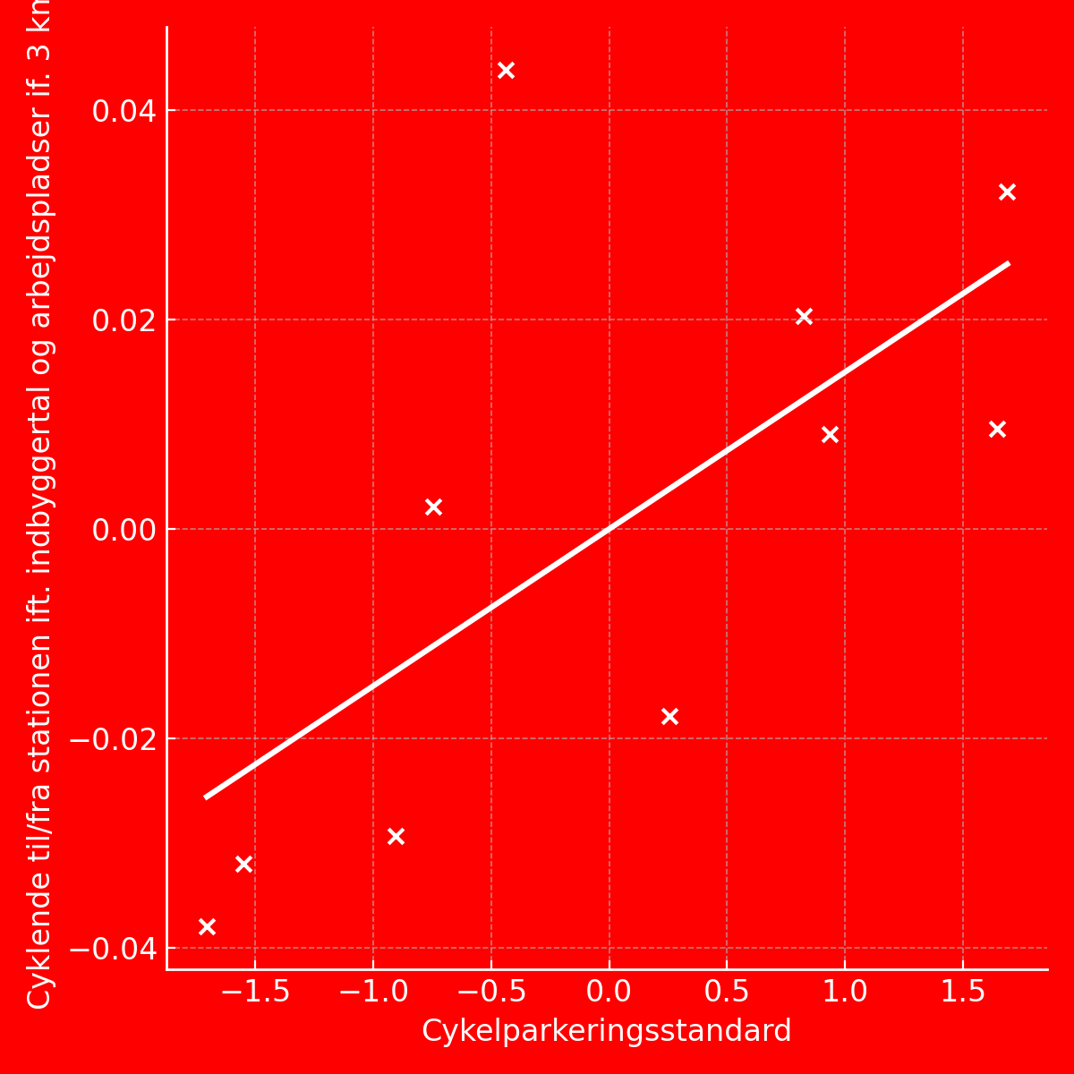 En væsentlig del af forklaringen er, at stationer med høj score ofte tilbyder aflåst cykelparkering, ekstra faciliteter som cykelpumper og reparationsstationer samt kapacitet nok til, at cyklister ikke behøver stille cyklen uden for stativerne. Det gør brugen både praktisk og tryg og signalerer samtidig, at cyklister er en prioriteret gruppe. Det modsatte billede fremstår på stationer som Virum og Jægersborg, hvor forholdene er ringere og parkeringskapaciteten på de attraktivt beliggende cykelparkeringer er utilstrækkelig. Her er cykelandelen lavere, selv når det omkringliggende byområde kunne understøtte en højere andel. Statistisk er der ikke tale om en enkel lineær bivariat sammenhæng mellem cykelparkering og cykelandel. Men når man tager højde for faktorer som befolkningstæthed, arbejdspladser og afgangsfrekvens, træder sammenhængen tydeligt frem, bliver lineær og samtidig signifikant. Det styrker indtrykket af, at højstandard cykelparkering er en central nøgle til at få flere til at kombinere cykel og tog i hverdagen.