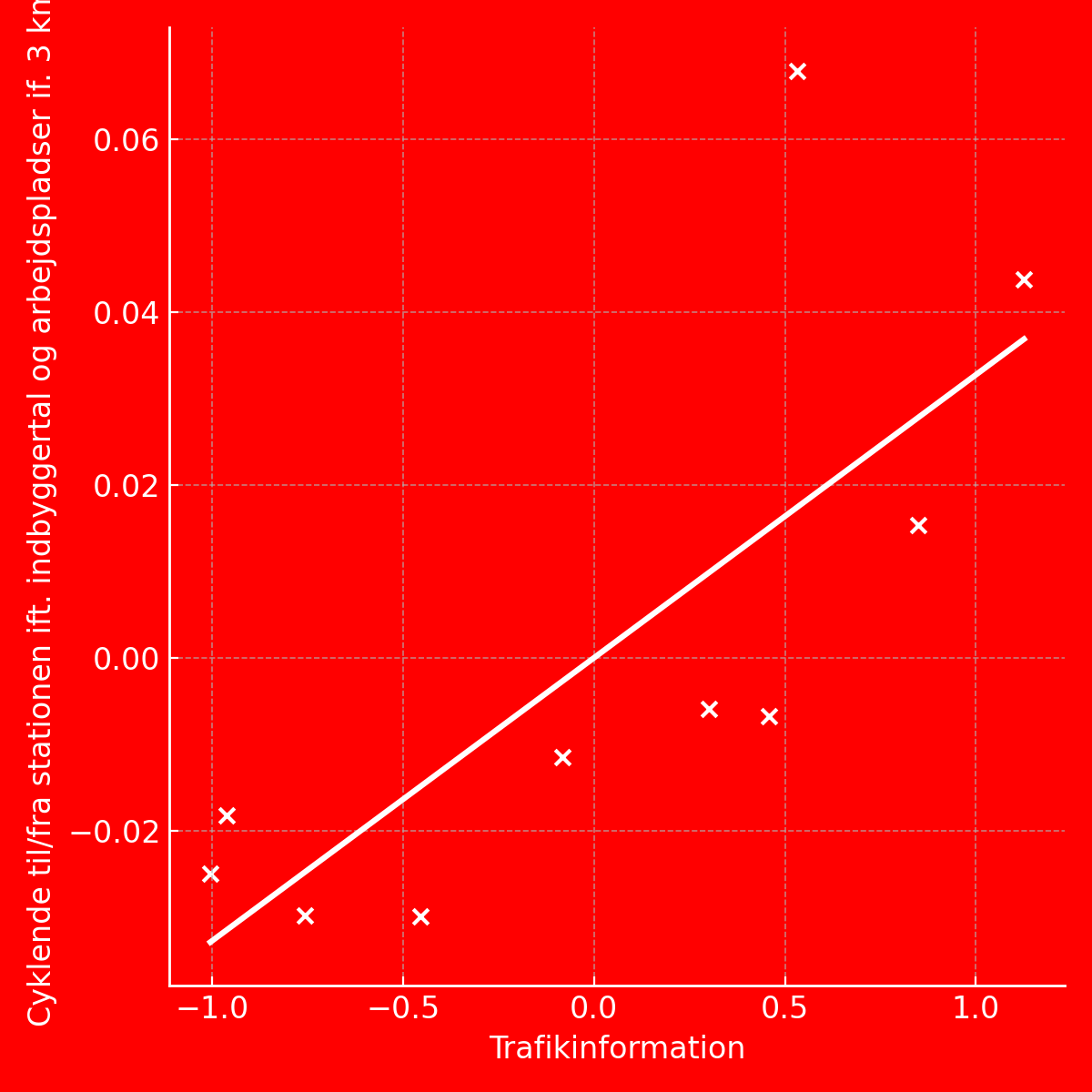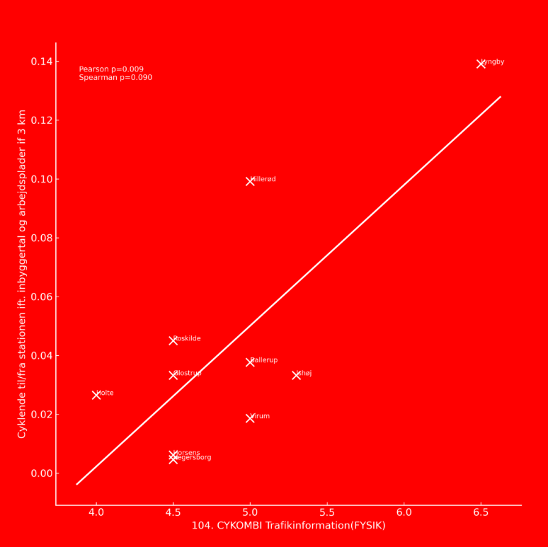 Der er en simpel sammenhæng mellem trafikinformationsniveauet på stationen og hvor mange, der vælger cykel+tog i kombination relativt til hvor mange beboere og arbejdspladser, der er inden for 3 km.