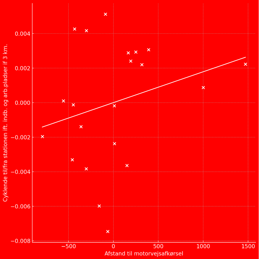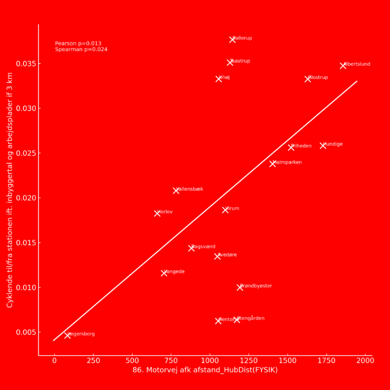 Konkurrencen med bilens transporttid er naturligvis et af de vigtigste parametre, når folk skal vælge cykel+tog-kombinationen. Derfor spiller nærheden til motorvejen også en betydelig rolle i transportvalget. Jo tættere stationen ligger på motorvejen, hvor rejsehastigheden for bilen naturligt er høj, desto flere vil være tilbøjelige til at vælge bilen frem for kombinationen. Vores undersøgelser viser en tydelig statistisk sammenhæng for S-togsstationer mellem stationens afstand til motorvejsnettet og andelen af cykel+tog-brugere, og denne sammenhæng holder sig robust, også når der tages højde for en række byplanrelaterede faktorer som befolkningstæthed, arbejdspladser i nærområdet og afgangsfrekvens fra stationen.