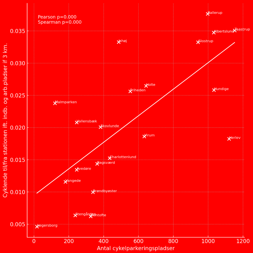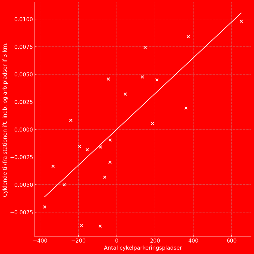 Der er for S-togsstationerne i undersøgelsen også statistisk belæg for sammenhængen mellem cykelparkering og cykelniveau, og denne holder sig tydelig, selv når der kontrolleres for byplanrelaterede variable og socioøkonomi. Særligt fremtrædende er eksempler som Ballerup Station, hvor der findes mange cykelparkeringspladser fordelt på flere sider af stationen samt flere underføringer, der gør det nemt at koble stisystemet til perronerne. Her ser vi en høj cykelandel i kombination med tog. Omvendt står stationer som Bagsværd og Avedøre, hvor der kun er få indgange, begrænset antal pladser og ringere fordeling. Resultatet er et mere fragmenteret cykelmiljø med færre faciliteter, flere omveje og lavere cykelandel. Tilsammen peger analyser og cases på, at rigelig og velplaceret cykelparkering er en grundlæggende forudsætning for at fastholde og øge antallet af cykel+tog-brugere.