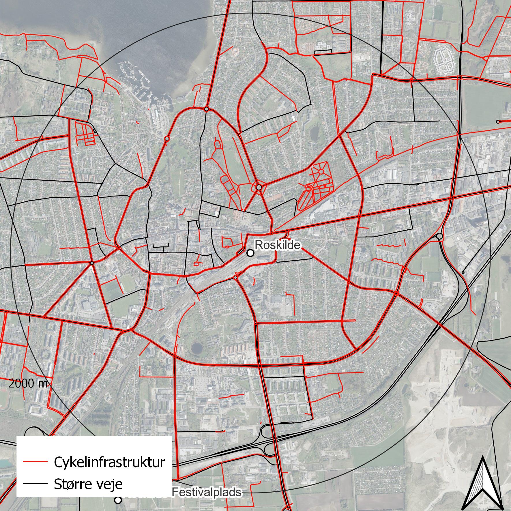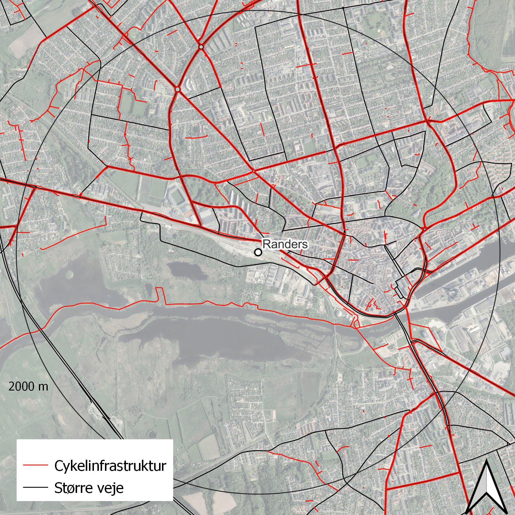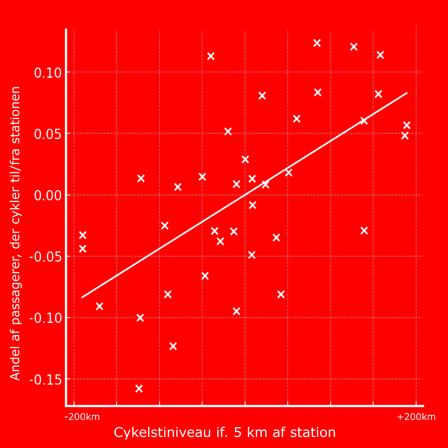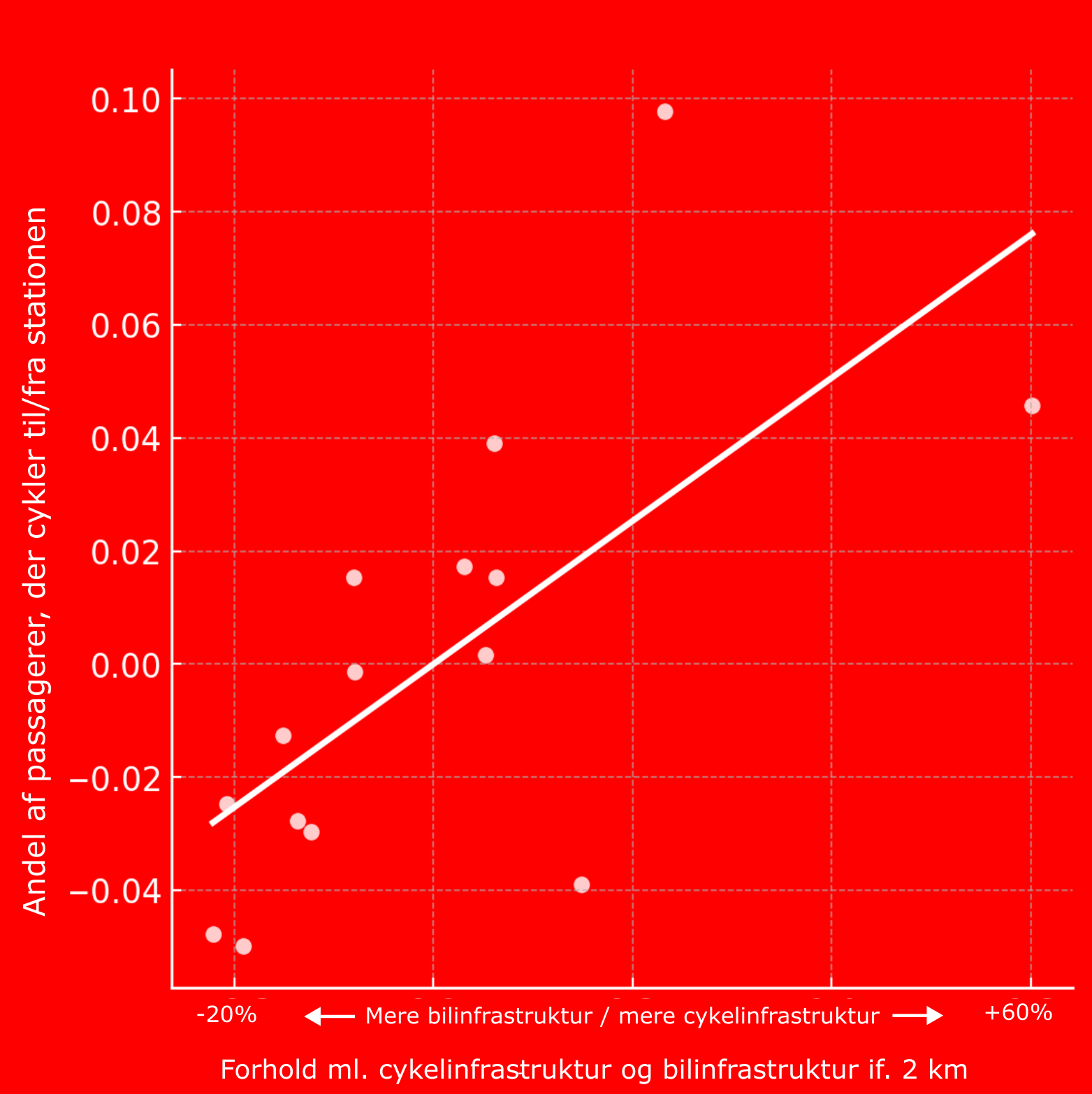 Når der er mere cykelinfrastruktur end bilinfrastruktur, er der flere muligheder og genveje for cyklister og flere omveje for bilister. Dette er også en måde at udnytte cyklens adræthed ift. bilens. At give cyklisterne en klar fordel på de kortere ture kan samtidig anspore nogle til at overveje kombinationen med tog på længere rejser i stedet for bil. I vores undersøgelser kan vi se en tydelig statistisk sammenhæng mellem den relative andel af cykelinfrastruktur i forhold til bilinfrastruktur inden for 2 km, hvilket også bakkes op af eksisterende teori og anbefalinger. Ser man alene på niveauet af cykelinfrastruktur på op til 5 km, viser det sig, at dette også har en betydning, også når der tages højde for faktorer som befolkningstæthed.