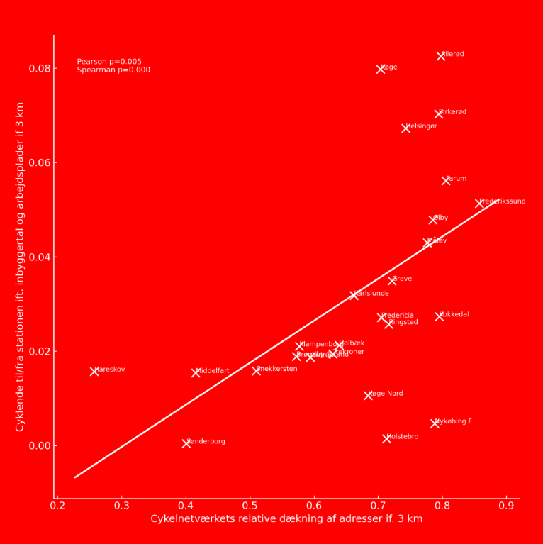 Denne tendens underbygges af vores kvantitative analyser. Allerede i de bivariate analyser er der en tydelig sammenhæng mellem omfanget af cykelinfrastrukturen og antallet af cykel+tog-brugere. Og billedet ændrer sig ikke stort, når der i de multiple modeller kontrolleres for en række andre relevante byplanmæssige forhold som befolkningstæthed, arbejdspladstæthed og stationens generelle udbud. Det peger på, at cykelnetværket i sig selv spiller en selvstændig og signifikant rolle for transportvalget.