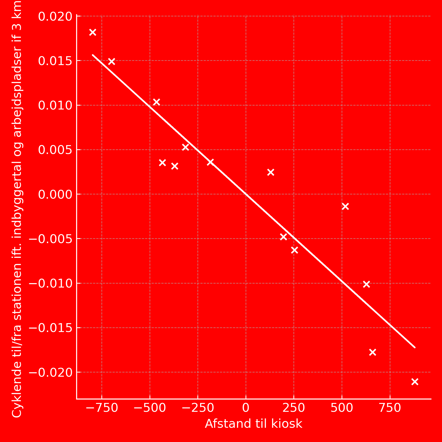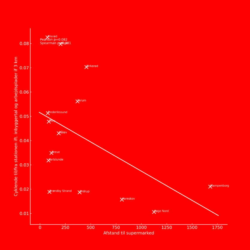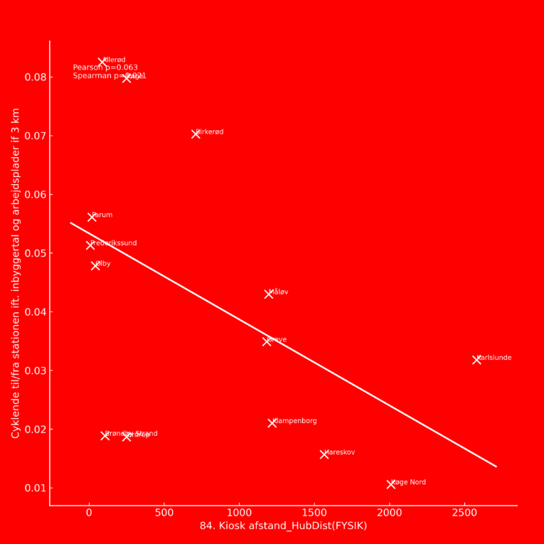 Der er en klar sammenhæng mellem cykel+tog-brug og tilstedeværelsen af kiosker tæt ved stationen, viser vores undersøgelser, omend kun for S-togsstationer. Denne sammenhæng fremgår både i de bivariate analyser, og når der kontrolleres for andre forhold som befolknings- og arbejdspladstæthed. For supermarkeder findes sammenhængen bivariat, men ikke når der kontrolleres for andre faktorer.