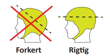 Hjelmen skal sidde så den dækker både baghovedet, tindingerne og panden – og det gør den, når den sidder vandret set fra siden, og der kun er to-tre centimeter mellem øjenbrynene og hjelmens forkant.