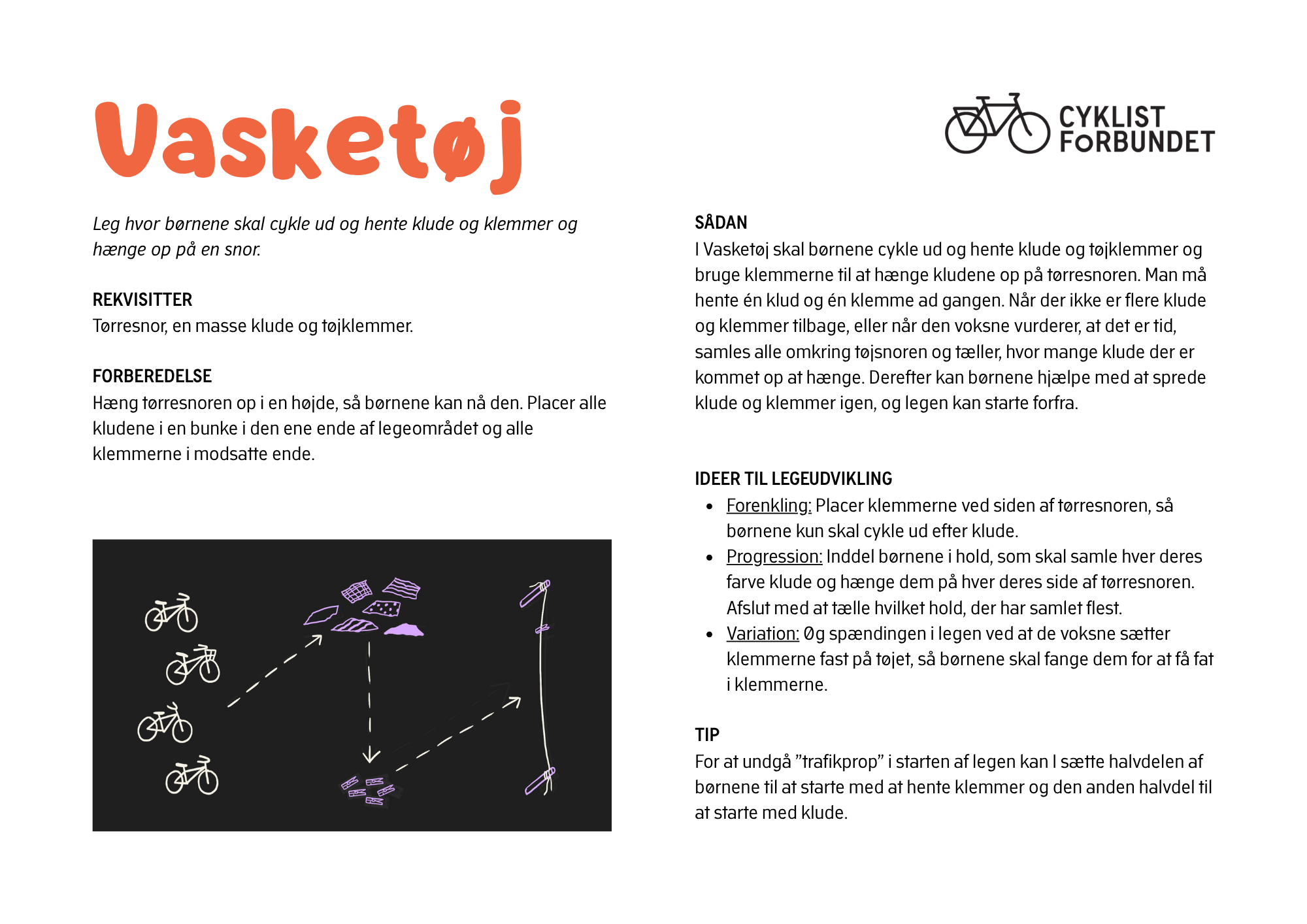 I denne video kan du blive klogere på Vasketøj, hvor børnene cykler ud for at hente klude og klemmer og hænger dem op på en tørresnor. Legen træner børnenes grov- og finmotorik, cykelkontrol og evne til at løse en fælles opgave – og så er det sjovt at se tørresnoren blive fyldt undervejs.