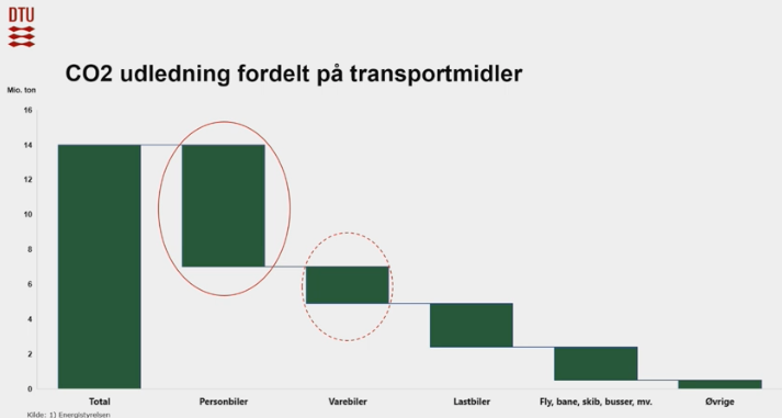 Billedet: CO2-udledning fordelt på transportmidler. Personbiler står for ca. 50 %.