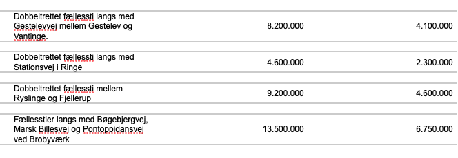 FaaborgMidtfyn Kommune har søgt tilskud til cykelstier. Der er søgt til fire projekter fortrinsvis i Ringe-området, se billedet. Det er fint, at det bliver sikkert at cykle på Stationsvej i Ringe, mellem Ryslinge og Fjellerup og i Brobyværk. Cyklistsikkerhed kan man ikke få for meget af, og hvis vi skal have de unge generationer til at nyde bevægelsen, friheden og muligheden for at komme rundt på egen hånd, er det rart, at deres skolevej er sikker.