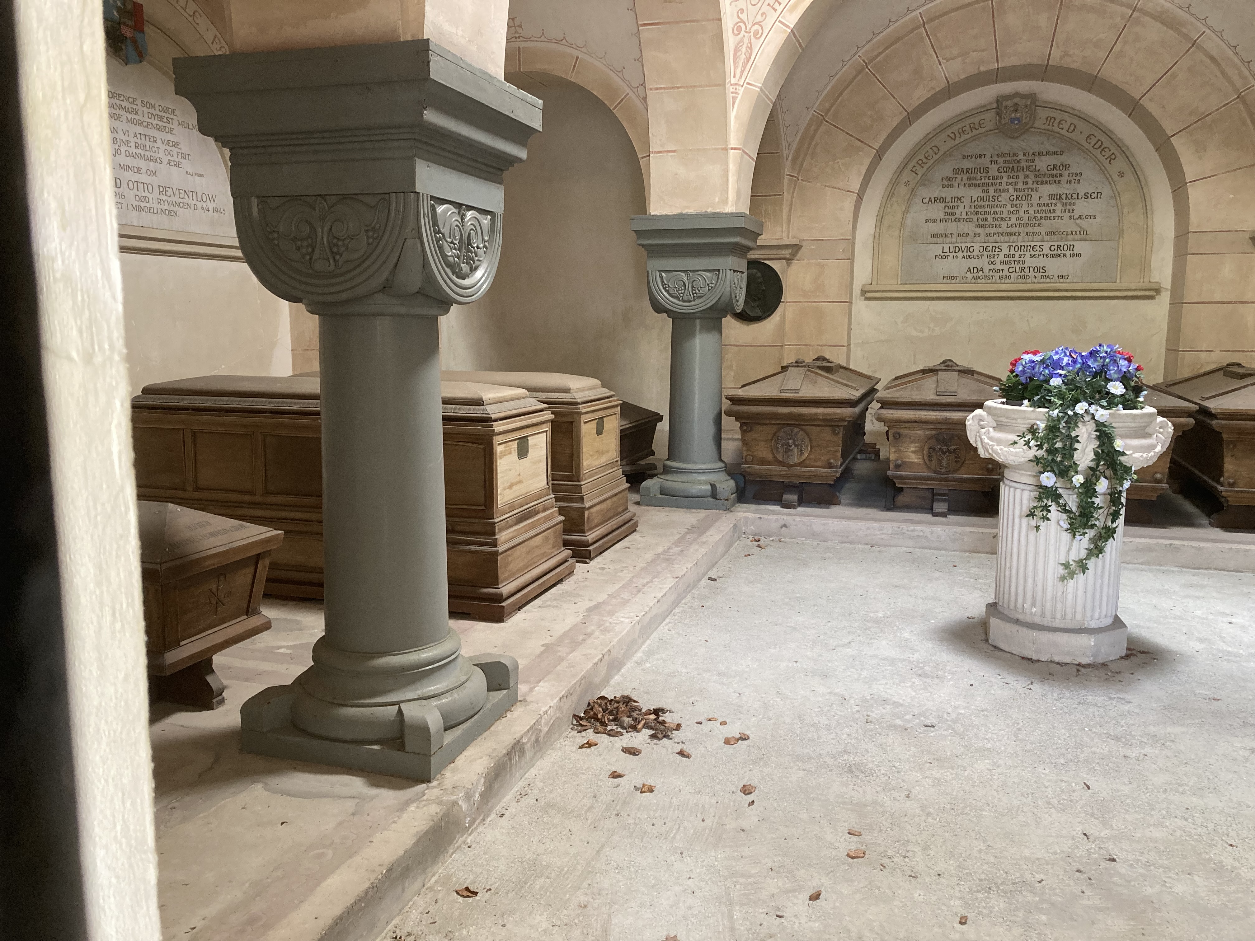 Herunder et foto af indgangen til Grøns Mausoleum ved siden af Vedbæk Kirke.
