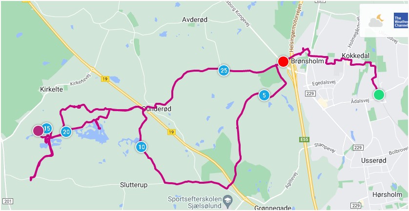 Vejret havde været rigtig fint på turen, men da vi var ved at krydse Fredensborg Kongevej vest for Brønsholm landsby, kunne vi konstatere at det var ved at trække op til regnvejr, så vi besluttede at afslutte ture ved Fredensborg Kongevej.