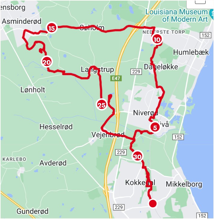 Herfra til Vejenbrød og tilbage til Kokkedal Station.