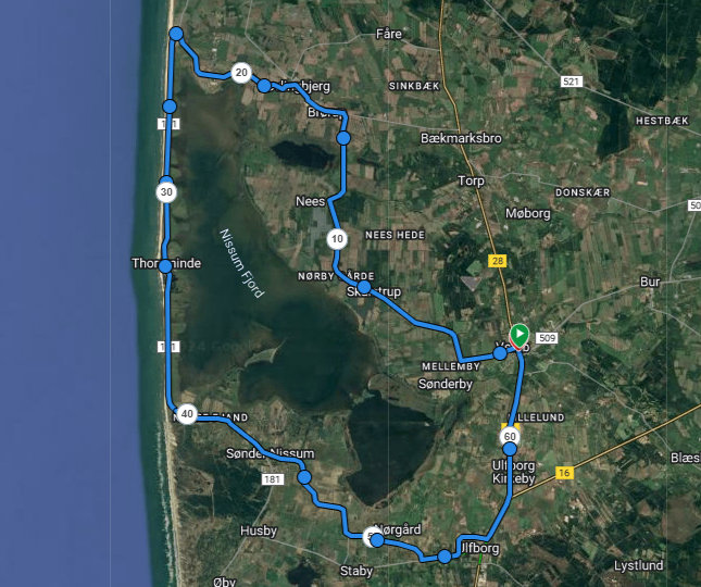 Længde: 65 km – med afgang fra Vemb - Nissum Fjord rundt - retur Vemb.