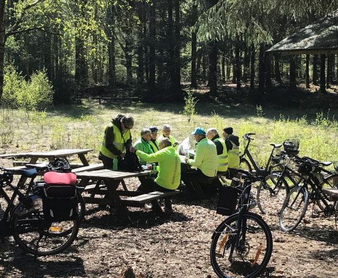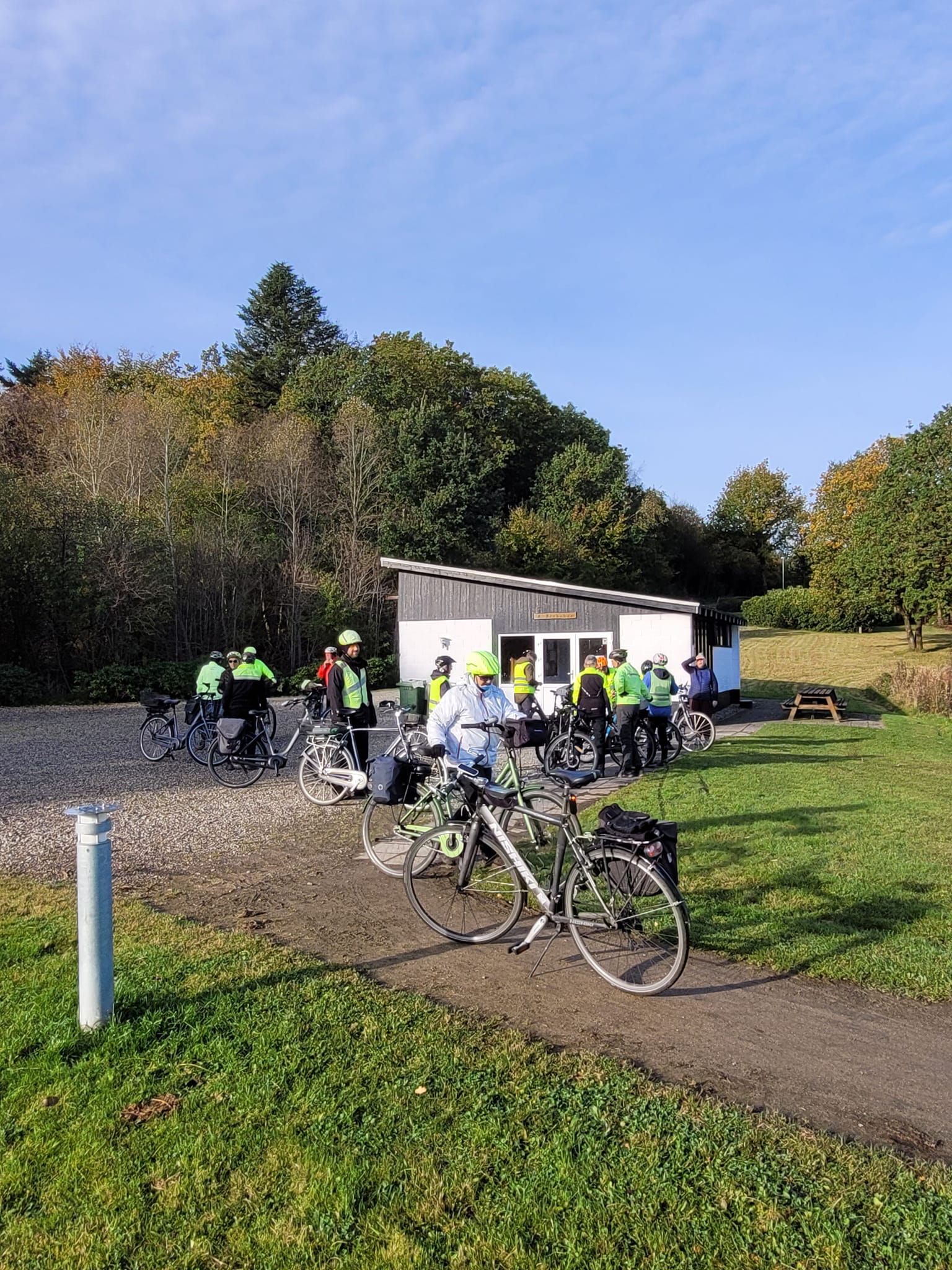 Over Rydevej, Kjeldsmarksvej, Ryde, til Ryde Skov, hvor vi i skovbørnehaven Knasten indtog vores frokost. Efter cykling/vandring om Stendis Søerne – cyklede vi hjem ad Trabjergvej over Borbjerg.