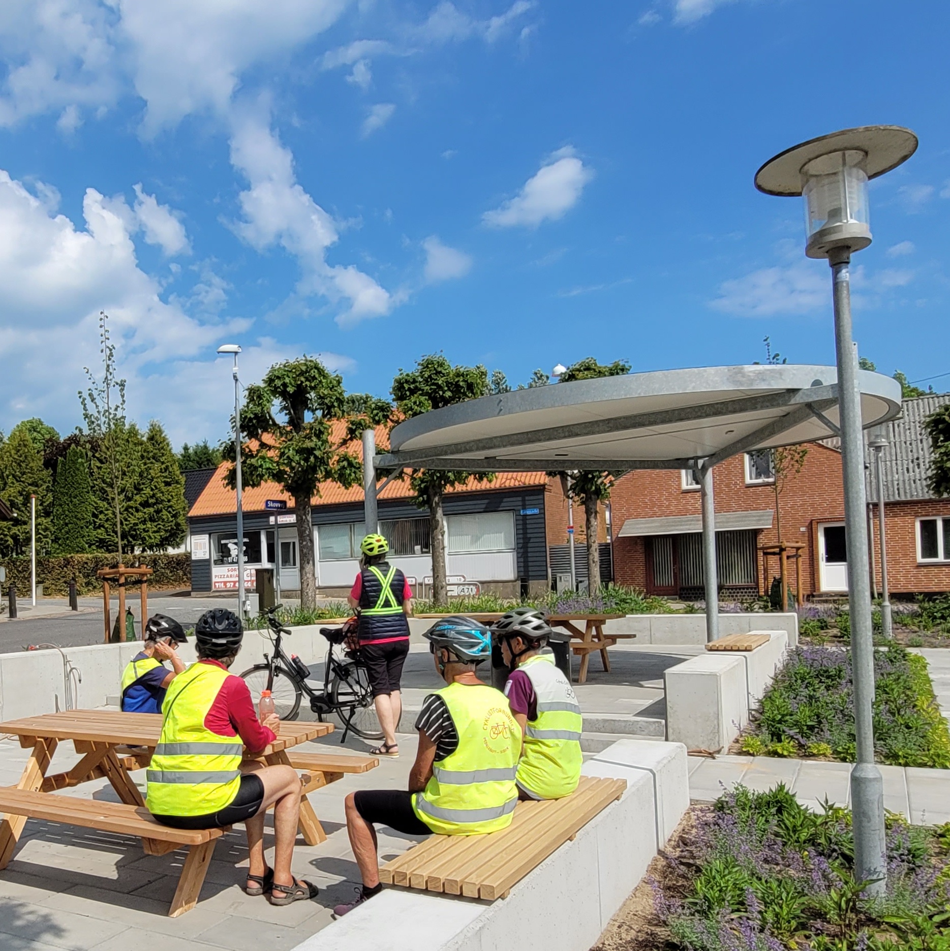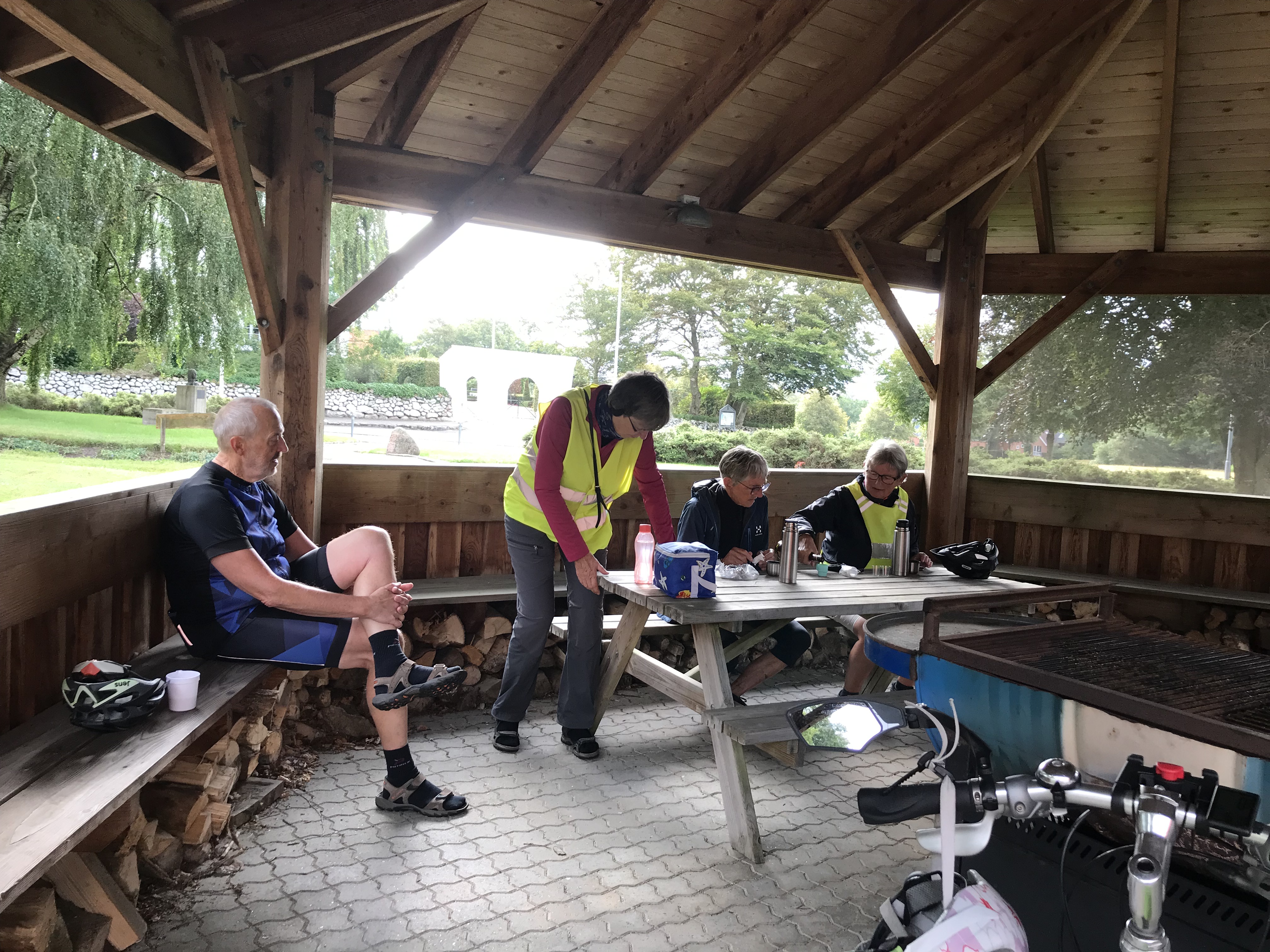 Flokken på 10 deltagere satte sig i bevægelse og kørte til Nr. Felding Kirke og Sørvad, for stop ved det nye torv med borde og bænke og tag for - i dag skygge.