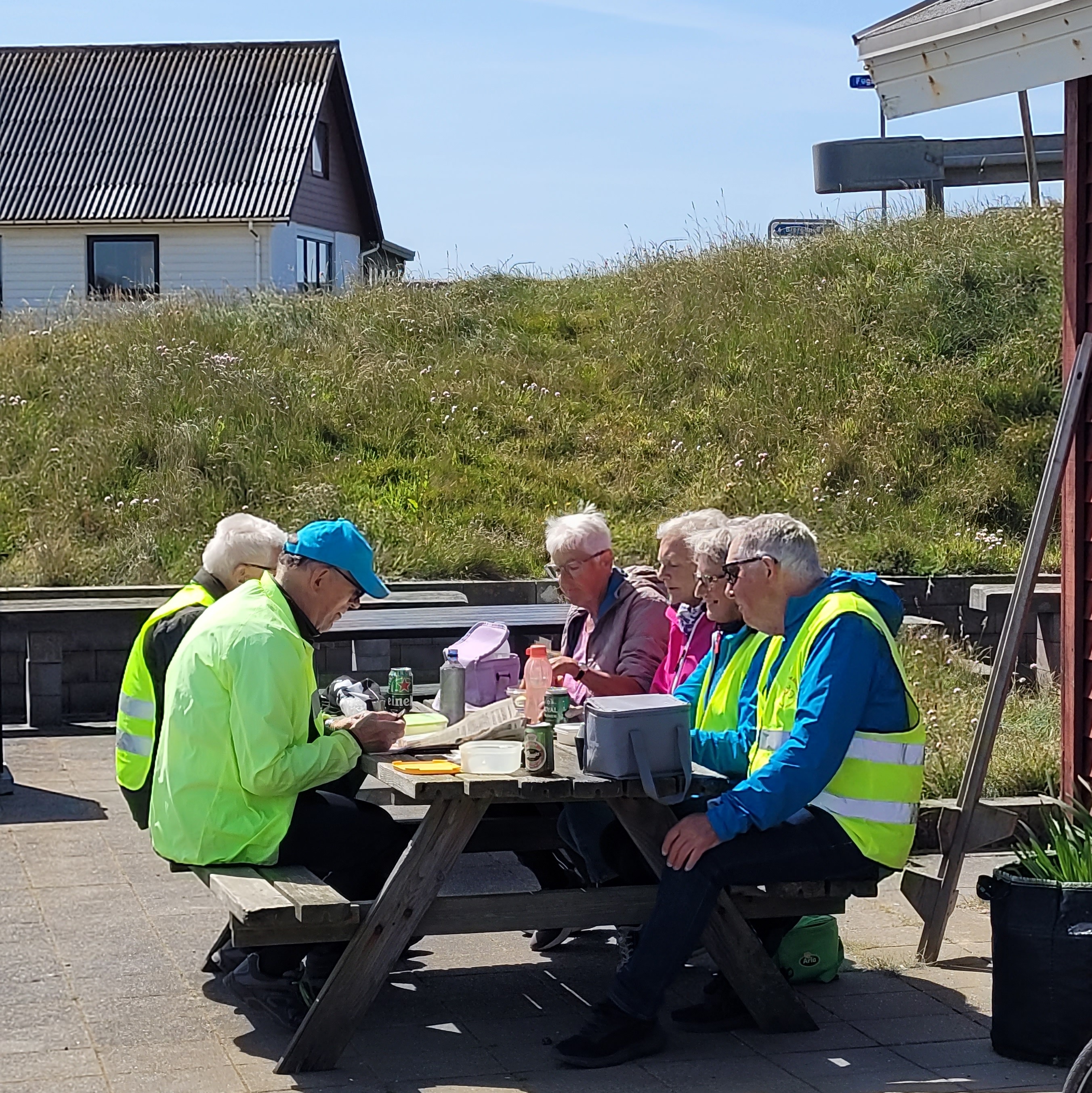 I Thorsminde fik vi frokost ved Grill Huset og derefter var der mulighed for handel ved Jagt & Fiskeri – ligesom nogle fik friske fisk med hjem. Der var både rødspætter og havkatte i spil. Og vi var henne ved Strandings Museet St. George – før vi via cykelsti kom til Sønder Nissum. Her holdt vi pause igen – og tog vejen forbi Pallisbjerg – og ned omkring Staby Efterskole. Efter lidt afsluttende rundkørsel i Ulfborg – kunne vi alle takke Gunner for en god dagstur med hyggelig atmosfære og god energi.