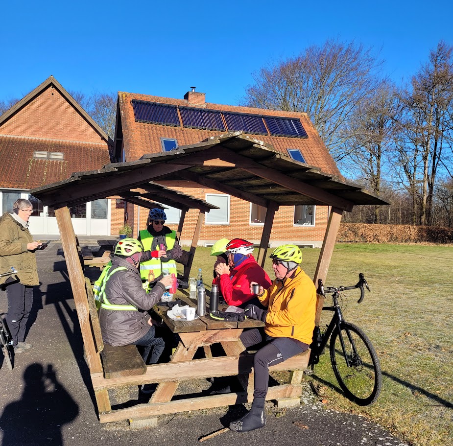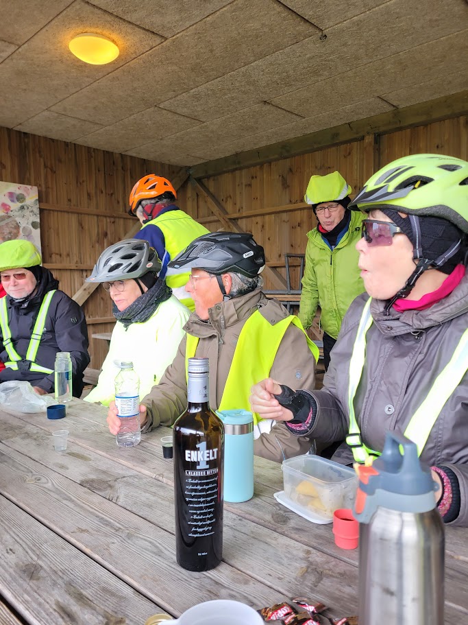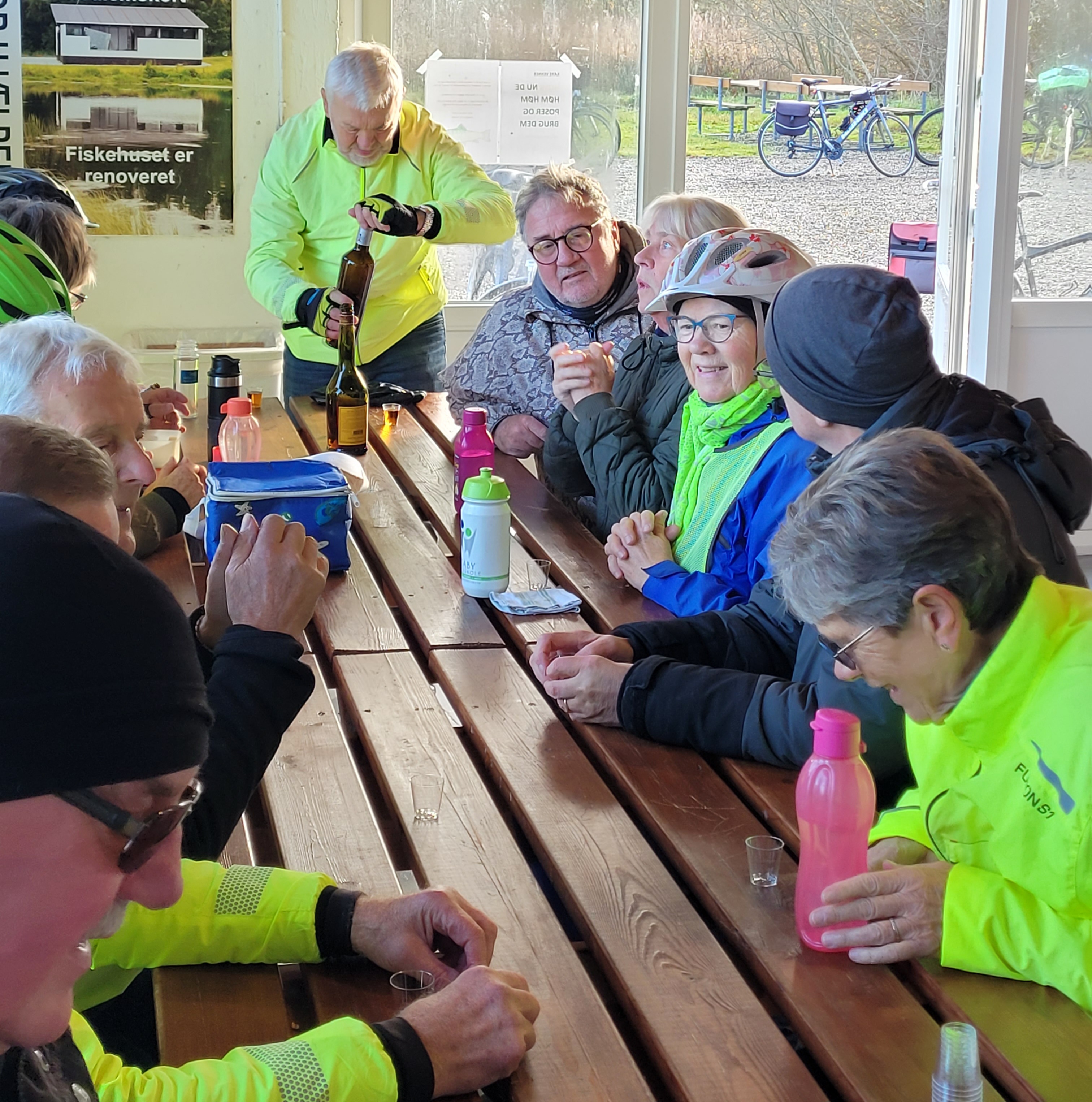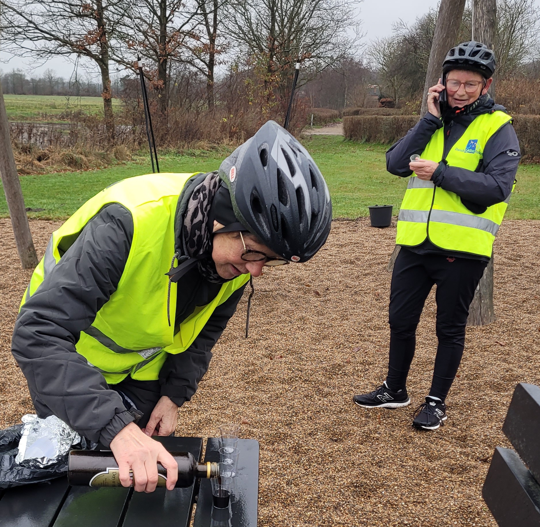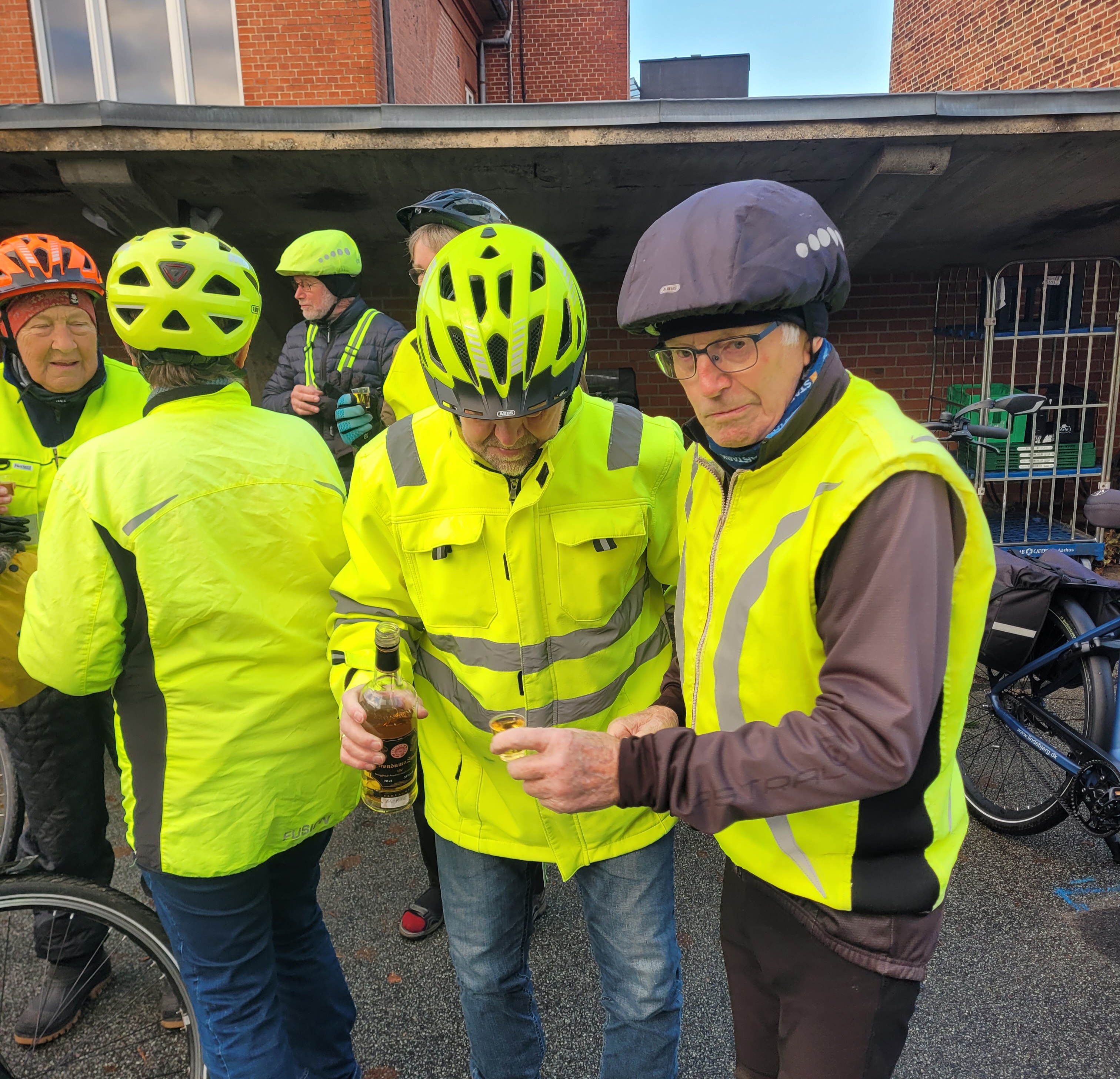 Pause ved Præstegårdsparken, hvor Bent Conrad havde Fernet Branka med. Der var en skilling til overs fra julefrokost og disse midler blev så omsat i ”medicin” til det cyklende folk. Mange tak – det var stærkt og skrapt, men godt.