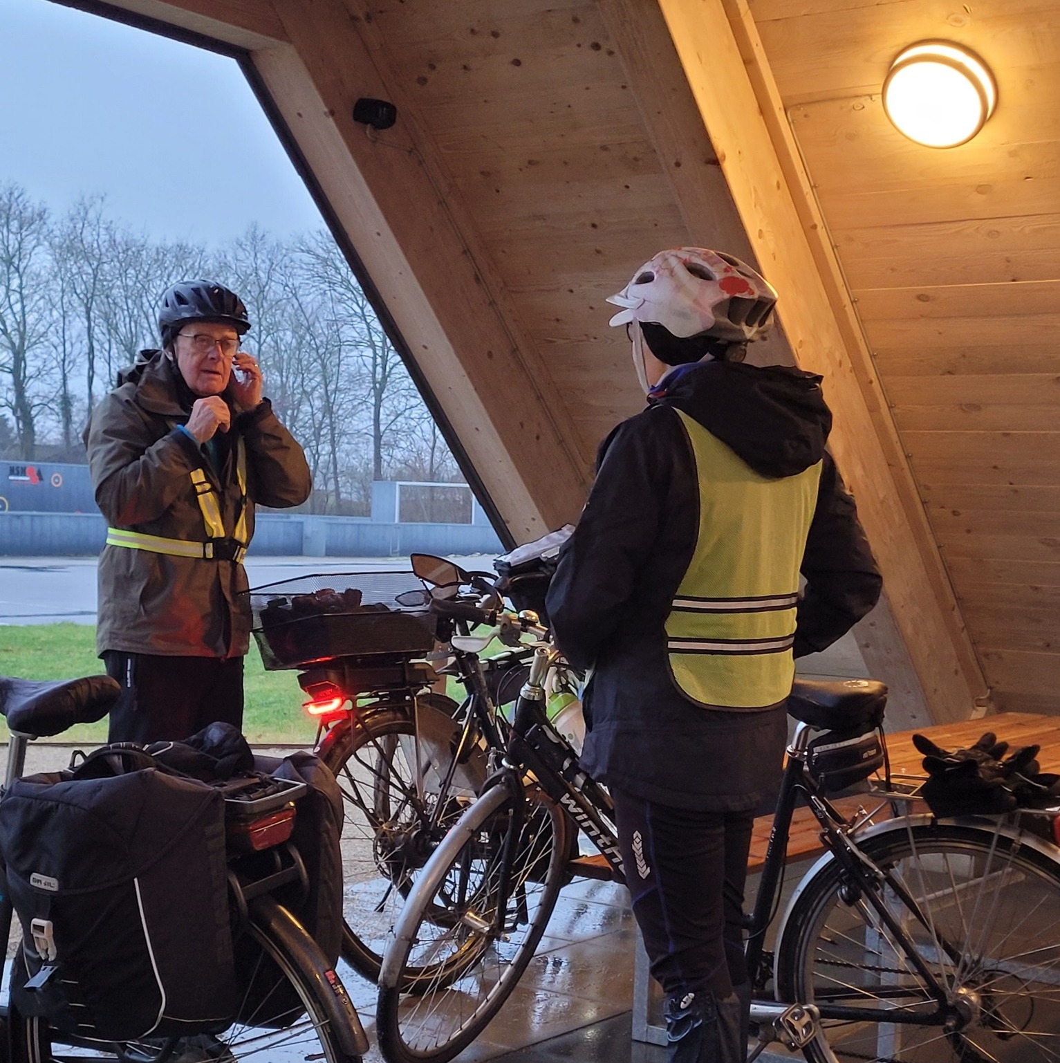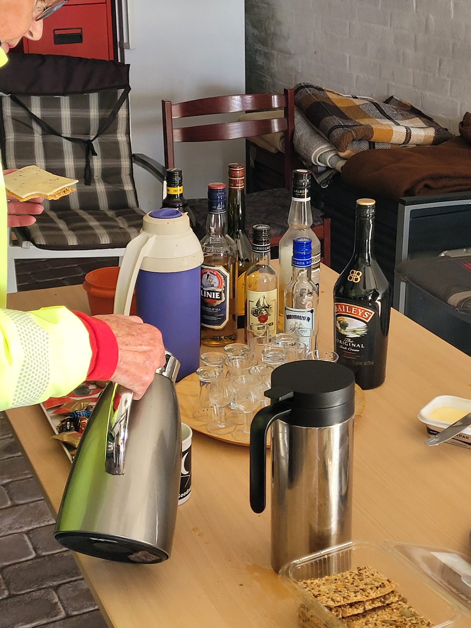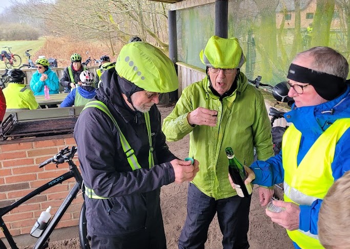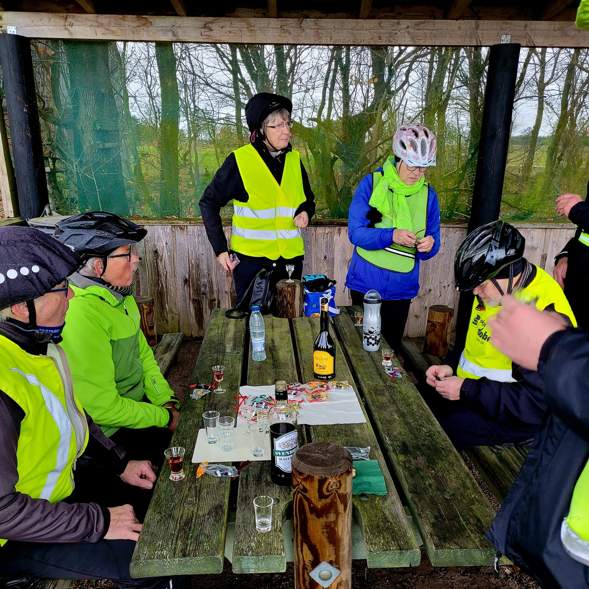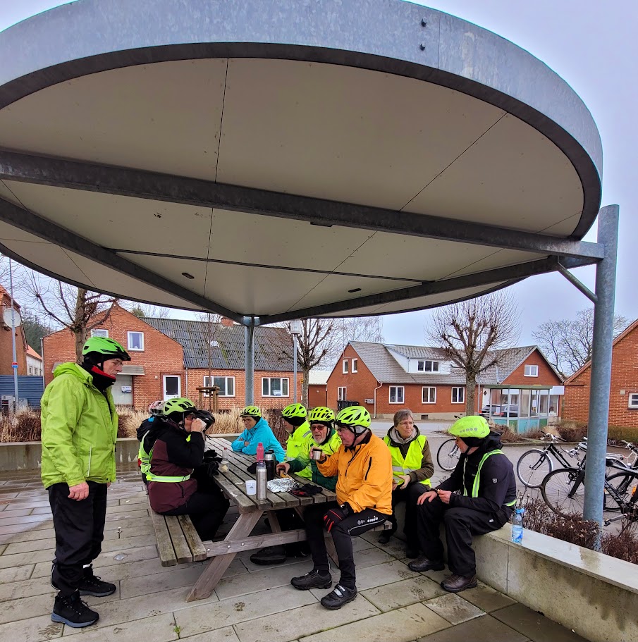 Pause ved Præstegårdsparken, hvor Bent Conrad havde Fernet Branka med. Der var en skilling til overs fra julefrokost og disse midler blev så omsat i ”medicin” til det cyklende folk. Mange tak – det var stærkt og skrapt, men godt.