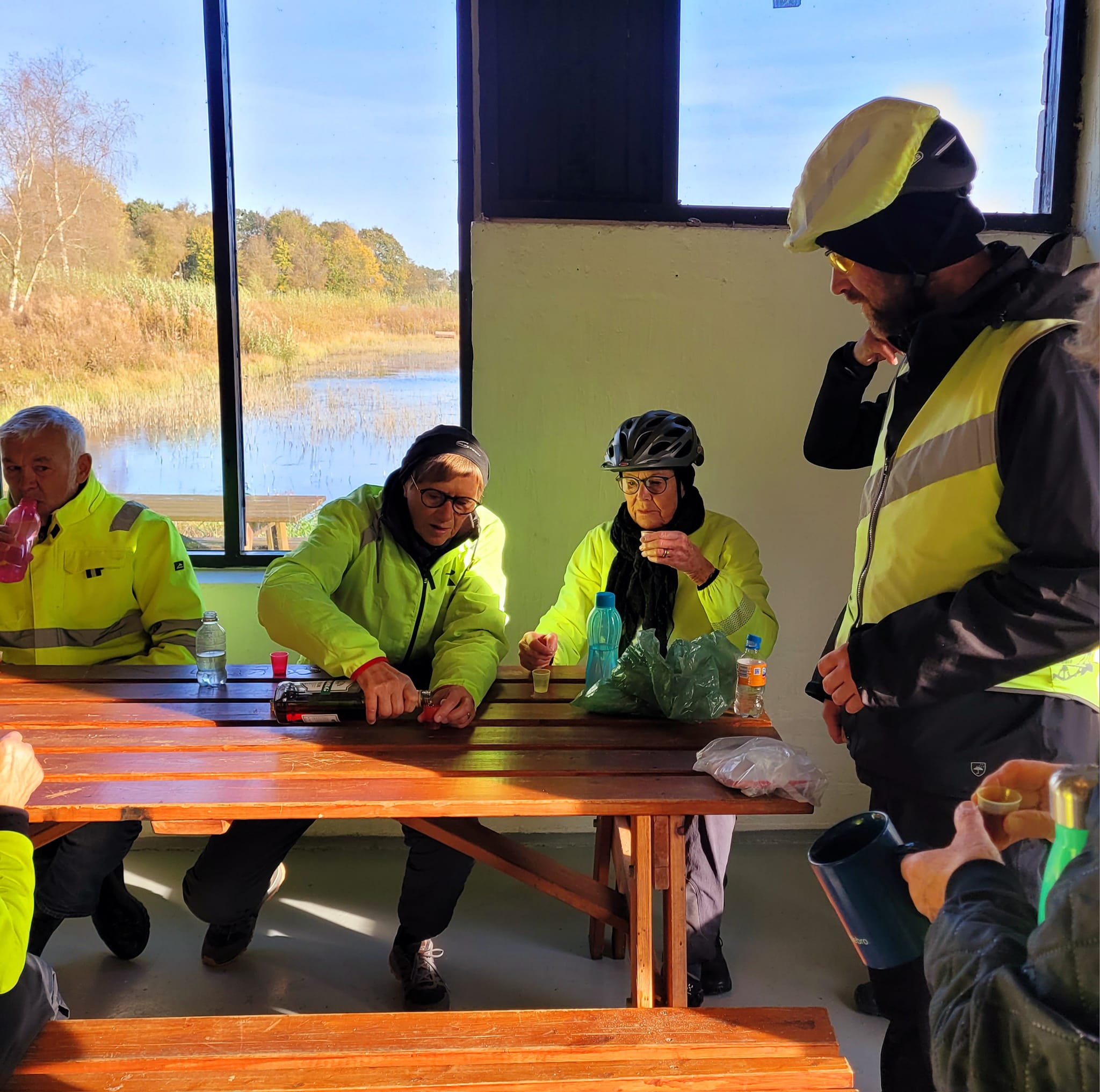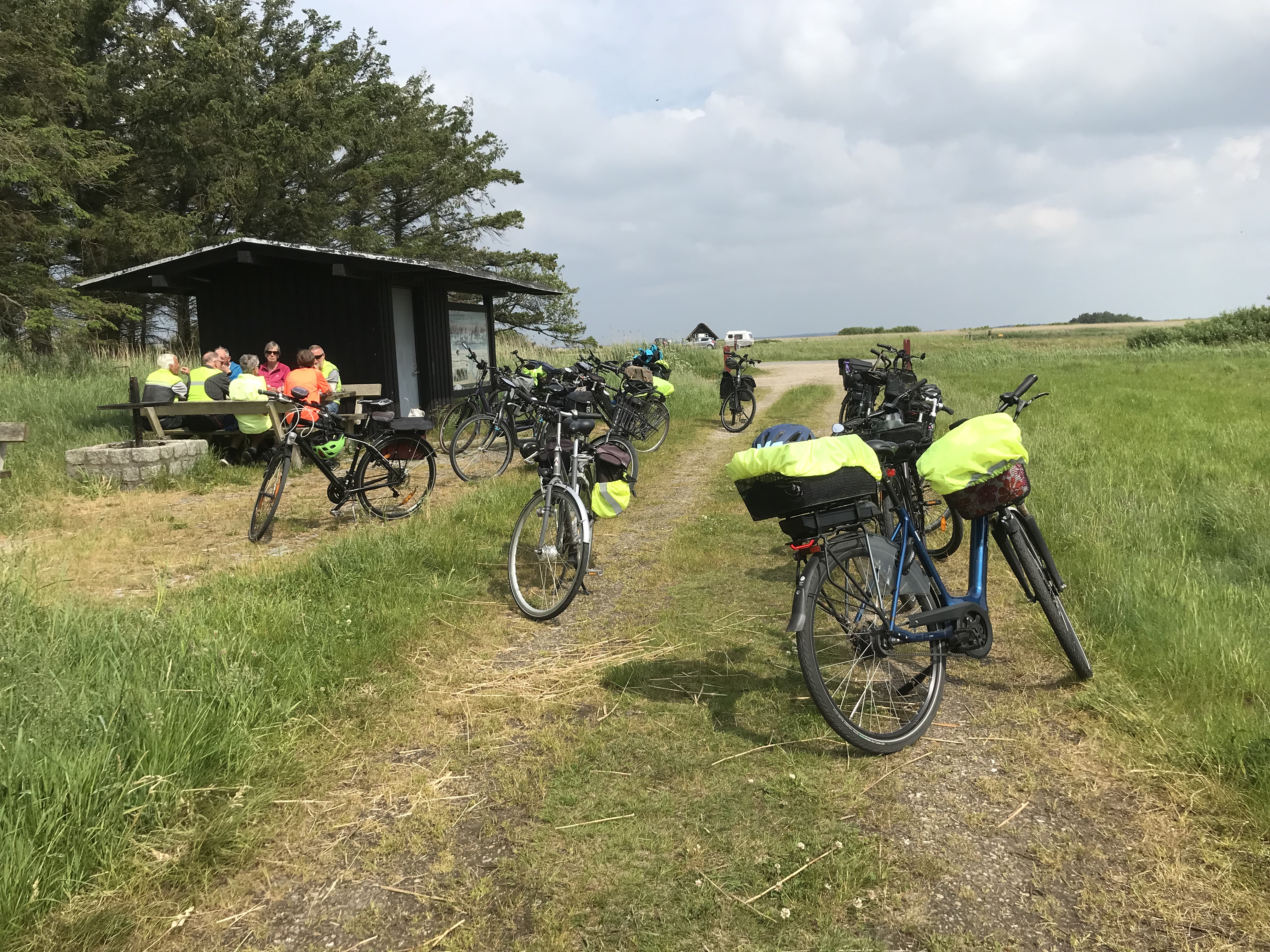 Vi var ved Æ Fywerhus. Forbi kirken – over dæmningen igen til Tambohus Kro. Videre til Søndbjerg Strand. Her holdt vi pause og én fra holdet serverede en likør lavet af slåen. Det smagte godt. Vi cyklede langs Søndbjerg Strand og hjem mod Odby. Det var herligt cykelvejr og vi havde en god stemning under hele turen. Der indgik 5 små grusveje på turen. Tak for i dag.