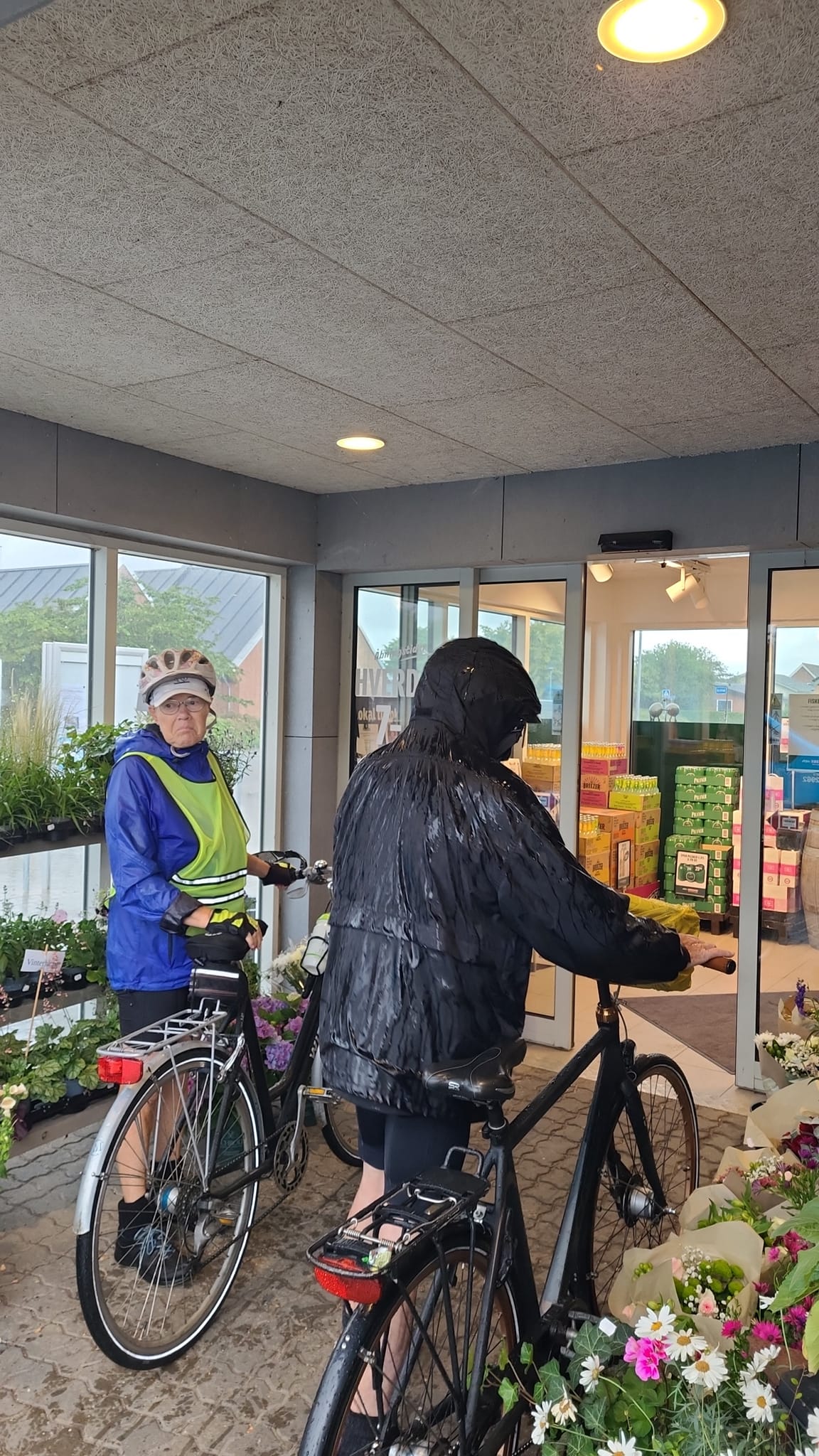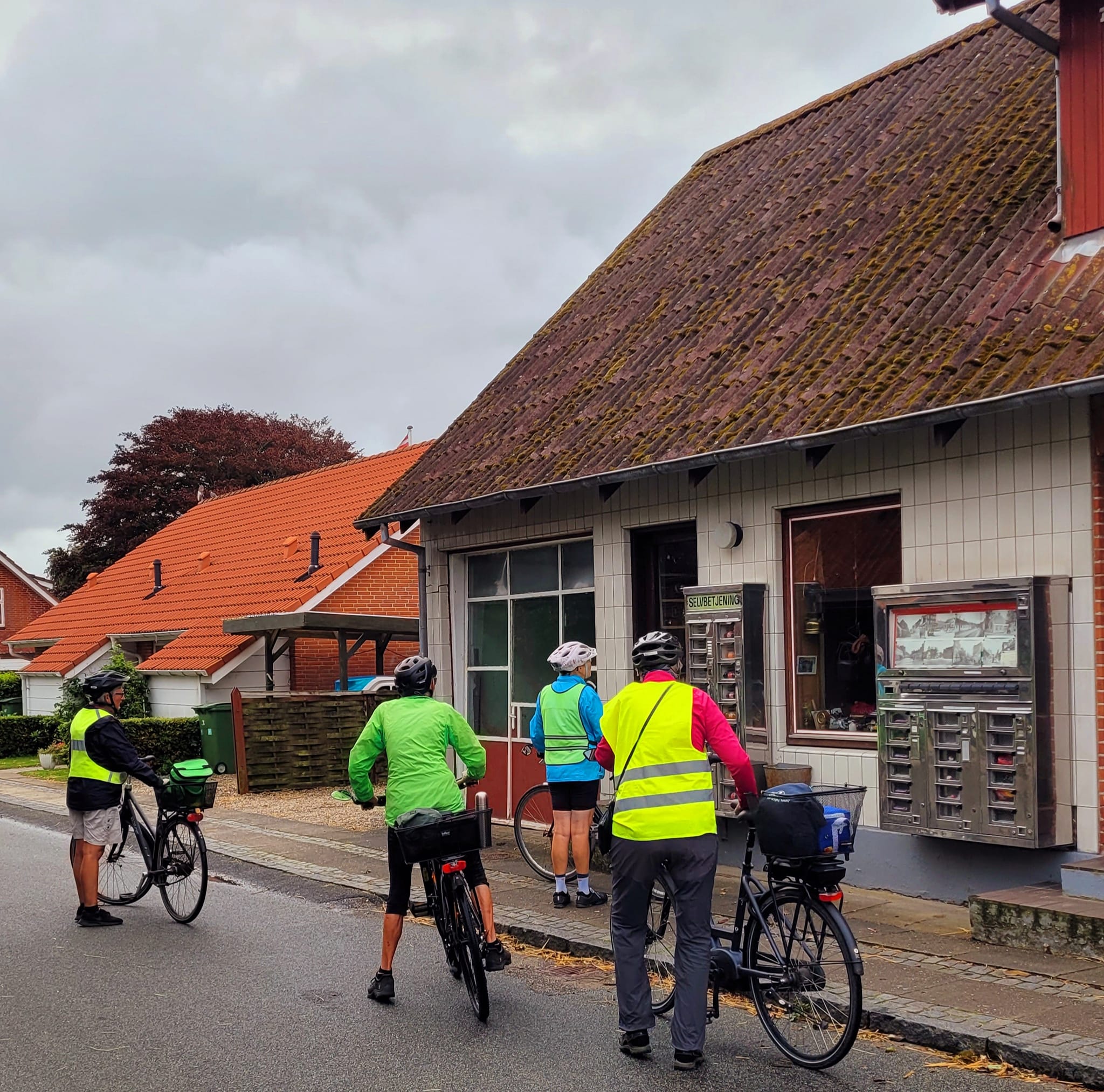 Dejligt cykelvejr og frem for alt, så var det tørvejr. Pause ved Tvis-købmanden.